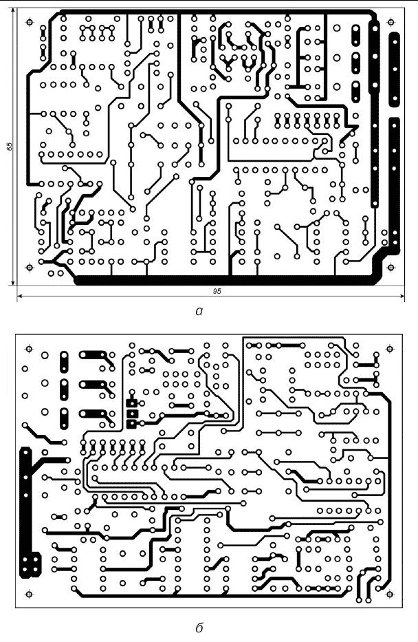 Микросхемы типа LF356 (IC31, IC32) можно заменить на LM318 или NE5534, однако в результате такой замены могут возникнуть проблемы с налаживанием. В качестве усилителя IC35, помимо указанной на схеме микросхемы типа IL071, можно использовать микросхемы CA3140, ОР27 или ОР37. Микросхема типа R061 (IC36) без проблем заменяется на CA3140. В качестве транзисторов Т1-Т3 помимо указанных на принципиальной схеме можно использовать транзисторы типа BU2508, BU2515 или ST2408. Рабочая частота кварцевого резонатора должна составлять 6 МГц. Можно использовать любой другой кварцевый элемент с частотой резонанса от 2 до 6 МГц. Однако в таком случае потребуется пересчитать параметры элементов фильтра, выполненного на элементе IC34a. Для монтажа микропроцессора IC1 следует использовать специальную панельку. При этом микроконтроллер устанавливается на плату только после окончания всех монтажных работ. Данное условие необходимо соблюдать и при проведении регулировочных работ, связанных с выполнением пайки при подборе величин отдельных элементов. Особое внимание следует уделить изготовлению катушки L1, индуктивность которой должна составлять 500 мкГ. Конструкция этой катушки практически ничем не отличается от конструкции поисковой катушки L1, использованной в металлодетекторе, рассмотренном в предыдущем разделе. Она выполнена в виде кольца диаметром 250 мм и содержит 30 витков провода диаметром не более 0,5 мм. При использовании провода большего диаметра ток в катушке возрастет, однако еще быстрее будут расти значения паразитных вихревых токов, что приведет к ухудшению чувствительности прибора. Следует напомнить, что для изготовления катушки L1 не рекомендуется использовать лакированный провод, поскольку разность потенциалов между соседними витками при излучении импульса достигает 20 В. Если в процессе намотки витков катушки рядом окажутся проводники, например первого и пятого витков, пробой изоляции практически обеспечен. В свою очередь, это может привести к выходу из строя транзисторов передатчика и других элементов. Поэтому провод, используемый при изготовлении катушки L1, должен быть хотя бы в полихлорвиниловой изоляции. Готовую катушку также рекомендуется хорошо изолировать. Для этого можно воспользоваться эпоксидной смолой или различными пенными наполнителями. Катушку L1 следует подключать к плате с помощью двужильного хорошо изолированного провода, диаметр каждой жилы которого должен быть не меньше диаметра провода, из которого изготовлена сама катушка. Не рекомендуется использовать коаксиальный кабель из-за его значительной собственной емкости. Источником звуковых сигналов могут служить либо головные телефоны с сопротивлением от 8 до 32 Ом, либо малогабаритный громкоговоритель с аналогичным сопротивлением катушки. В качестве источника питания В1 рекомендуется использовать аккумуляторную батарею емкостью около 2 А/ч, поскольку ток, потребляемый данным металлоискателем, превышает 200 мА. Печатная плата с расположенными на ней элементами и источник питания размещаются в любом подходящем корпусе. На крышке корпуса устанавливаются переключатель P1, разъемы для подключения головных телефонов BF1 и катушки L1, а также выключатель S1 и кнопка S2. Налаживание Данный прибор следует настраивать в условиях, когда любые металлические предметы удалены от поисковой катушки L1 на 