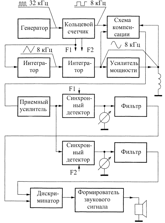 Прибор снабжен простейшим дискриминатором, который позволяет отфильтровать сигналы от небольших железных предметов, если последние не представляют интереса для поиска. Структурная схема Структурная схема приведена на рис. 14. Она состоит из нескольких функциональных блоков.