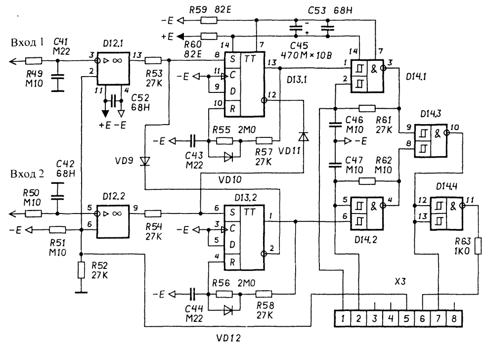 Дискриминатор (рис. 17) Дискриминатор состоит из компараторов на ОУ D12.1, D12.2 и одновибраторов на триггерах D13.1, D13.2. При прохождении датчика металлоискателя над металлическим предметом на выходах фильтров возникает полезный сигнал в виде двух полуволн напряжения противоположной полярности, следующих одна за другой одновременно на каждом выходе. Для небольших предметов из железа сигналы на выходах обоих фильтров будут синфазны: выходное напряжение "качнется" сначала в минус, а затем в плюс и вернется к нулю. Для неферромагнитных металлов и крупных железных предметов отклик будет другой: выходное напряжение только первого (верхнего по схеме фильтра) "качнется" сначала в минус, а затем в плюс. Реакция же на выходе второго фильтра будет противоположной: выходное напряжение "качнется" сначала в плюс, а затем в минус. Выходные импульсы компараторов запускают один из одновибраторов на триггерах D13.1, D13.2. Одновременно одновибраторы запуститься не могут - перекрестная ОС через диоды VD9, VD11 блокирует запуск одновибратора, если другой уже запущен. Длительность импульсов на выходах одновибраторов составляет около 0,5 с, и это в несколько раз больше, чем длительность обоих всплесков полезного сигнала при быстром движении датчика. Поэтому вторые полуволны выходных сигналов фильтров уже не влияют на решение дискриминатора - по первым всплескам полезного сигнала он запускает один из одновибраторов, другой при этом блокируется и такое состояние фиксируется на время 0,5 с. Чтобы исключить срабатывание компараторов от помех, а также, чтобы задержать по времени выходной сигнал первого фильтра относительно второго, на входах компараторов установлены интегрирующие цепи R49, С41 и R50, С42. Постоянная времени цепи R49, С41 в несколько раз больше, поэтому при одновременном приходе двух отрицательных полуволн с выходов фильтров первым сработает компаратор D12.2 и запустится одновибратор на триггере D13.2, выдав управляющий сигнал ("ферро" - железо). Формирователь звукового сигнала (рис. 17) Формирователь звукового сигнала состоит из двух идентичных управляемых генераторов звуковой частоты на триггерах Шмидта с логикой И на входе D14.1, D14.2. Запускается каждый генератор непосредственно выходным сигналом соответствующего одновибратора дискриминатора. Верхний генератор срабатывает по команде "металл" с выхода верхнего одновибратора - неферромагнитная мишень или крупный железный предмет - и выдает тональную посылку с частотой около 2 кГц. Нижний генератор срабатывает по команде "ферро" с выхода нижнего одновибратора - небольшие железные предметы - и выдает тональную посылку с частотой около 500 Гц. Длительности посылок равны длительности импульсов на выходах одновибраторов. Элементом D14.3 осуществляется смешивание сигналов двух тональных генераторов. Элемент D14.4, включенный по схеме инвертора, предназначен для реализации мостовой схемы включения пьезоизлучателя. Резистор R63 ограничивает всплески потребляемого микросхемой D14 тока, вызванные емкостным характером импеданса пьезоизлучателя. Это является профилактической мерой по уменьшению влияния наводок по питанию и предотвращению возможного самовозбуждения усилительного тракта. Схема внешних соединений (рис. 18)