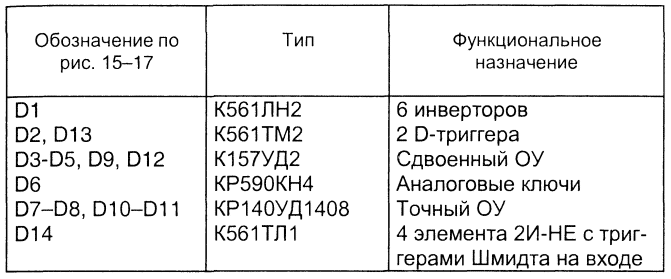 Назначение перечисленных элементов, в основном, очевидно и не требует дополнительных пояснений. Типы деталей и конструкция Типы используемых микросхем приведены в табл. 5. Таблица 5. Типы используемых микросхем Вместо микросхем серии К561 возможно использование микросхем серии К1561. Можно попытаться применить некоторые микросхемы серии К176. Сдвоенные операционные усилители (ОУ) серии К157 можно заменить любыми сходными по параметрам одиночными ОУ общего назначения (с соответствующими изменениями в цоколевке и цепях коррекции), хотя применение сдвоенных ОУ удобнее (возрастает плотность монтажа). Желательно, чтобы применяемые типы ОУ не уступали рекомендуемым типам по быстродействию. Особенно это касается микросхем D3-D5. ОУ синхронных детекторов и интеграторов ФВЧ по своим параметрам должны приближаться к прецизионным ОУ. Кроме типа, указанного в таблице, подойдут К140УД14, 140УД14. Возможно применение микромощных ОУ К140УД12, 140УД12, КР140УД1208 в соответствующей схеме включения. К применяемым в схеме металлоискателя резисторам не предъявляется особых требований. Они лишь должны иметь прочную и миниатюрную конструкцию и быть удобны для монтажа. С целью получения максимальной термостабильности следует использовать в схемах датчика, интеграторов и в схеме компенсации только металлопленочные резисторы. Номинал рассеиваемой мощности 0,125...0,25 Вт. Терморезистор R73 должен иметь отрицательный ТКС и номинал около 4,7 кОм. Рекомендуемый тип КМТ - 17 Вт. Потенциометры компенсации R74, R75 желательны многооборотные типа СП5-44 или с нониусной подстройкой типа СП5-35. Можно обойтись и обычными потенциометрами любых типов. В этом случае желательно их использовать два. Один - для грубой подстройки, номиналом 10 кОм, включенный в соответствии со схемой. Другой - для точной подстройки, включенный по схеме реостата в разрыв одного из крайних выводов основного потенциометра, номиналом 0,5...1 кОм. Конденсаторы С45, С49, С51 - электролитические. Рекомендуемые типы - К50-29, К50-35, К53-1, К53-4 и другие малогабаритные. Остальные конденсаторы, за исключением конденсаторов колебательного контура датчика, - керамические типа К10-7 (до номинала 68 нФ) и металло- пленочные типа К73-17 (номиналы выше 68 нФ). Конденсатор контура С61 - особый. К нему предъявляются высокие требования по точности и термостабильности. Конденсатор С61 состоит из нескольких (5...10 шт.) конденсаторов, включенных параллельно. Настройка контура в резонанс осуществляется подбором количества конденсаторов и их номинала. Рекомендуемый тип конденсаторов К10-43. Их группа по термостабильности - МПО (т.е. приблизительно нулевой ТКЕ). Возможно применение прецизионных конденсаторов и других типов, например, К71-7. В конце концов, можно попытаться использовать старинные термостабильные слюдяные конденсаторы с серебряными обкладками типа КСО или какие-либо полистирольные конденсаторы. Диоды VD1-VD12 типа КД521, КД522 или аналогичные кремниевые маломощные. В качестве диодов VD1-VD4 и VD5-VD8 удобно также использовать интегральные мостовые диодные сборки типа КД906. Выводы (+) и (-) диодной сборки спаиваются вместе, а выводами (~) она включается в схему вместо четырех диодов. Защитные диоды VD13-VD14 типов КД226, КД243, КД247 и другие малогабаритные на ток от 1 А. Микроамперметры - любого типа на ток 50 мкА с нулем посередине шкалы (-50 мкА...0...+50 мкА). Удобны малогабар