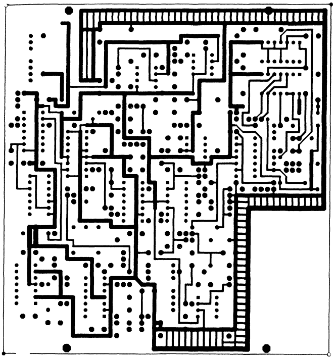 Печатная плата электронной части металлоискателя может быть изготовлена на основе готовой универсальной макетной печатной платы под DIP корпуса микросхем с шагом 2,5 мм. В этом случае монтаж ведут одножильным медным луженым проводом в изоляции. Такая конструкция удобна для экспериментальной работы. Более аккуратная и надежная конструкция печатной платы получается при разводке дорожек традиционным способом под заданную схему. Ввиду ее сложности, в этом случае печатная плата должна быть с двухсторонней металлизацией. Использованная автором топология печатных дорожек приведена на рис. 19 - сторона печатной платы со стороны установки деталей и на рис. 20 - сторона печатной платы со стороны пайки. Рисунок топологии приведен не в натуральную величину. Для удобства изготовления фотошаблона автор приводит размер печатной платы по внешней рамке рисунка - 130x144 (мм). Особенности печатной платы: