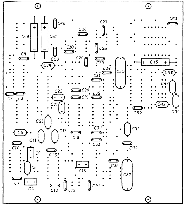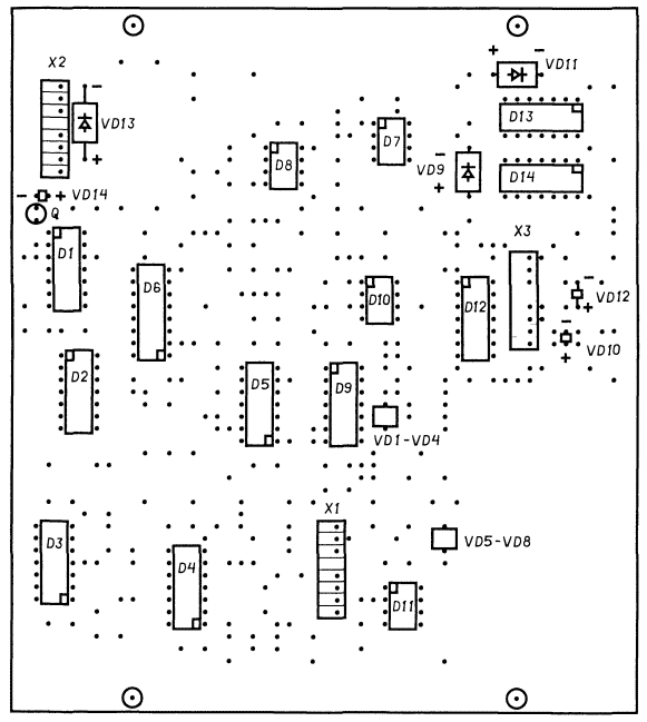 Обычный реагент для травления стандартной печатной платы из стеклотекстолита с медной фольгой 35...50 мкм - водный раствор хлорного железа FeCl3. Известны и другие способы изготовления печатных плат в домашних условиях. Расположение деталей на печатной плате приведено на рис. 21 (микросхемы, разъемы, диоды" и кварцевый резонатор), на рис. 22 (резисторы и перемычки) и на рис. 23 (конденсаторы).