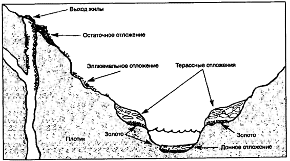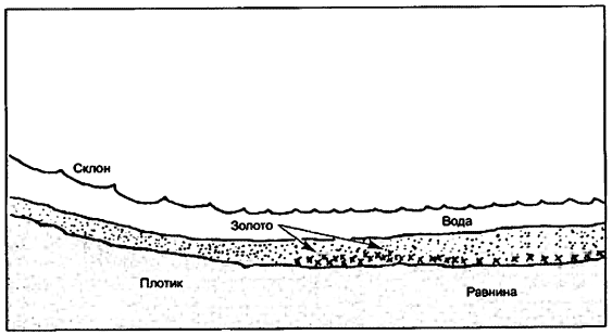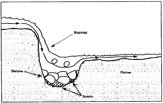 Дно рек состоит из камней, песка, гравия, глины (осадочные образования), которые везде лежат на коренной породе (плотике). Сильные дожди в гористой местности обычно вызывают очень сильные потоки воды, которые смывают донные отложения до коренной породы. Это приводит к постепенному размыванию дна и углублению русла реки в течение длительного времени. Кроме того, потоки воды с гор смывают все новые порции золота в реку, где оно смешивается с другими материалами. При этом золото, будучи тяжелее этих материалов, в процессе перемещения гравия и песка по течению реки быстро уходит вниз на дно, где и задерживается неровностями коренной породы. Поскольку золото в 6-7 раз тяжелее, чем другие материалы, окружающие его, требуются несоизмеримо больше усилий для его перемещения вниз по реке, по сравнению с каменным материалом. Поэтому даже при сильных дождях, когда вода в реке поднимается и с большей силой начинает размывать осадочные отложения на дне и нести камни и гальку, самородки золота, лежащие на плотике, нередко остаются неподвижными. В том случае, когда сила потока достаточна, чтобы перемещать и золото, оно может откладываться в другом месте, где сила потока ослабевает. Ловушки золота на плотике Неровности дна играют большую роль в накоплении золота. Потоки воды, способные перемещать золото, обычно вымывают эти неровности от глины и песка, оставляя место только для золота. Некоторые типы пород образуют большое количество неровностей, обеспечивая многочисленные ловушки для золота. Особенно эффективны трещины и выступы, расположенные перпендикулярно течению. Препятствия на пути потока, например большой камень, тормозят поток и могут способствовать отложению золота перед ним или за ним. Одним из наиболее общих мест в реке для поиска золота является то место, где плотик образует обрыв глубокий водоем. Любое место, где фиксированный объем воды внезапно втекает в значительно большой объем воды, или место, где скорость потока замедляется, является ловушкой для золота, которое может накапливаться в этих местах в больших количествах. Так водопад может иметь значительное накопление золота, но не всегда. Иногда вода создает такую сильную турбулентность, что любое золото, попавшее в яму под водопадом во время наводнения, будет вымываться. С другой стороны, в яме могут оказаться большие валуны, которые защищают золото от вымывания. В этом случае вам сильно повезет. Рис. 46. Неровности дна реки - ловушки перемещаемого золота В некоторых случаях золото, вымытое из ямы под водопадом, может оседать сразу же за ямой, где течение не набрало еще достаточную скорость. Иногда в жаркую погоду ручьи мелеют и яма под водопадом содержит мало воды, позволяя выгребать из нее самородки.