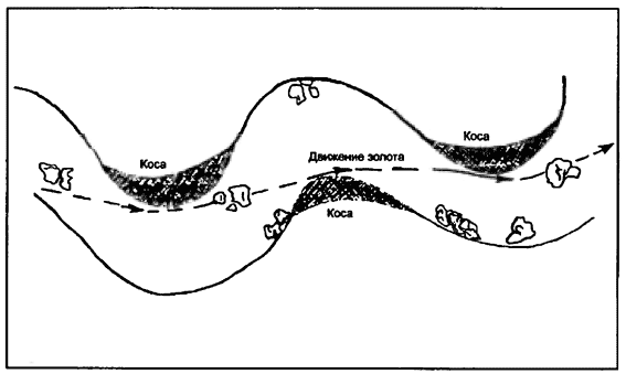 Пути движения золота Из-за своей тяжести золото движется вдоль реки по пути наименьшего сопротивления. В большинстве случаев это кратчайшее расстояние между большими изгибами реки. Откладывается на косах внутренних изгибов реки. Если на пути золота есть большие камни, то под некоторыми из них золото может накапливаться. Под другими камнями его может и не быть.