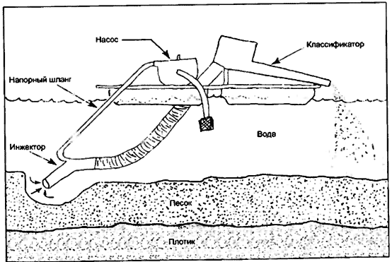 Более крупная минидрага весит около 90 кг. Диаметр шланга - 100 мм. При идеальных условиях может обработать около 1000 кг материала в час. В действительности такие идеальные условия встречаются очень редко. На практике приходится передвигать большие камни, разрыхлять донные отложения и т.д. Рис. 55 Минидрага За рубежом (в Канаде, США, Бразилии, Новой Гвинее) такие минидраги завоевали большую популярность и с успехом применяются для добычи золота на неглубоких водоемах. Пробник золота Это другой тип электронного устройства для поиска золота, отличный от металлоискателя. Он представляет собой щуп, на одном конце которого имеется сенсорное устройство, чувствующее наличие золота в почве, а на другом конце ручка и электронный блок с органами управления. Когда щуп втыкают в грунт, и его сенсорный датчик входит в контакт с частицами золота, динамик прибора издает специфический звуковой сигнал и загорается лампочка. При наличии в почве магнетита звуковой тон меняется, а световой сигнал меняет цвет. В отличие от обычных металлоискателей датчик этого прибора должен иметь непосредственный контакт с частицей золота, чтобы появился положительный сигнал, свидетельствующий о наличии золота Частицы золота могут быть очень мелкими, какие обычным металлоискателем не улавливаются.