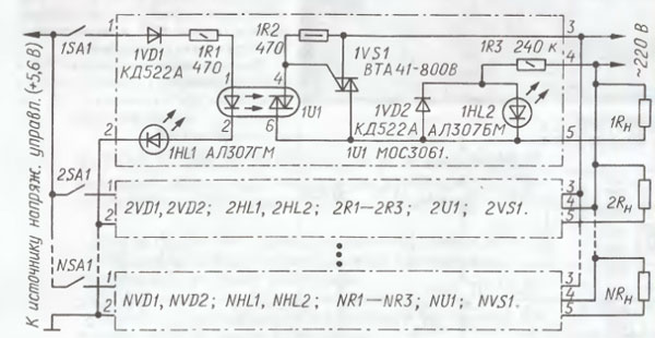 Èñòî÷íèêîì óïðàâëÿþùåãî íàïðÿæåíèÿ ìîæåò ñëóæèòü ïðîñòåéøèé áëîê ïèòàíèÿ, ñîáðàííûé ïî ñõåìå íà ðèñ. 2. Äëÿ óïðàâëåíèÿ âûâîäû 2 âñåõ êàíàëîâ îáúåäèíÿþò â îáùèé ïðîâîä, à âûâîäû 1 ïîäêëþ÷àþò ê áëîêó ïèòàíèÿ êàæäûé ïîñëåäîâàòåëüíî ñ òóìáëåðîì. Ïåðåêëþ÷åíèåì òóìáëåðîâ ïîäàþò ñåòåâîå íàïðÿæåíèå íà òó èëè èíóþ íàãðóçêó. Òóìáëåðû ãîäÿòñÿ ëþáûå, âïëîòü äî ìàëîìîùíûõ ÂÄÌ1-08.