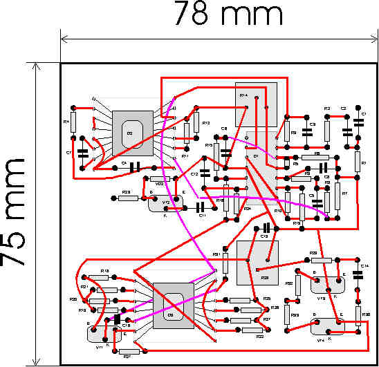Таблица составлена таким образом, чтобы обеспечить минимальные переключения при переходе 1200/ 4800. На скоростях 300/600/1200/2400 Бод модем работает в типовом канале тональной частоты, на скорости 4800 Бод - в нестандартном канале тональной частоты (удвоенной ширины). ГУН передатчика выполнен на микросхеме D1.4. Его выходной сигнал поступает на кольцевой счетчик. Кольцевой счетчик выполняет функции формирования ступенчатого синусоидального сигнала, модулированного по частоте с непрерывной фазой (16-ступенчатая синусоида без разрыва фазы на выходе резистивного сумматора). Спектр выходного сигнала, полученного таким образом, имеет минимальную ширину и равен 1,15 от полосы девиации. ГУН работает на частоте в 16 раз выше частот девиации, указанных в таблице, и управляется входным цифровым потоком. На транзисторах VT3 и VT4 выполнены элементы шунтирования выходного сигнал' и управление включением передатчика. На элементах VD1, VD3, VBW'eor брана схема паразитного питания от RS232 компьютера, а на микросхеме DD4 - стабилизатор напряжения 5 В. Светодиод VD1 (АЛ107А) является индикатором зависания порта RS232, индикатором работы приема и передачи. Индикация осуществляется на основе частичного изменения светимости диода. Имеются следующие режимы индикации. Если программа выгружена из ОЗУ, а индикатор горит, значит завис порт. Общее свечение означает, что модем работает, и загружена в ОЗУ резидентная программа TNC. При передаче яркость свечения диода VD1 уменьшается на 50%, а при приеме - на 30%. Изменяя параметры сопротивлений R11, R12, R24 плавно или дискретно с помощью переключателей, легко получить необходимые скорости передачи в обычном канале тональной частоты или в канале удвоенной ширины. Для получения пяти скоростей эти сопротивления можно выполнить в виде линейки из трех по пять сопротивлений, установленных на навесном переключателе или на плате. Наиболее удобно выполнить ряд этих сопротивлений на основе сопротивлений СП 19-1. Неточность установки номиналов частот 20% существенного влияния на работу схемы нс оказывает. Уменьшение значения емкости конденсатора С8 в два раза дает удвоенную полосу пропускания. Конструкция модема может быть следующей. Модем выполняется на двусторонней плате шириной 75 мм и длиной 78 мм. Плата впаивается в торцы двух разъемов 25 pin. Корпус имеет П-образную форму и накрывает по высоте и длине на 3 мм разъемы. Нижняя плоская часть корпуса вставляется между упорными фланцами разъемов. Крепление корпуса осуществляется без винтов за счет защелок снизу в боковины П-образного корпуса. Переключатели и переменные сопротивления устанавливаются с нижней стороны платы. Для доступа к ним предусматриваются отверстия в нижней плоской части корпуса. РКК "Энергия", Публикация: Н. Большаков, rf.atnn.ru