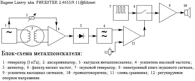 ЭНЦИКЛОПЕДИЯ РАДИОЭЛЕКТРОНИКИ И ЭЛЕКТРОТЕХНИКИ Электронный металлоискатель. Энциклопедия радиоэлектроники и электротехники Энциклопедия радиоэлектроники и электротехники / Индикаторы, детекторы, металлоискатели Металлоискатель представляет собой относительно простое устройство, электронная схема которого обеспечивает хорошую чувствительность и стабильность работы. Отличительной особенностью такого устройства является его низкая рабочая частота. Катушки индуктивности металлоискателя работают на частоте 3 кГц. Это обеспечивает, с одной стороны, слабую реакцию на нежелательные сигналы (например, сигналы, возникающие при наличии мокрого песка, мелких кусочков металла и т.д.), а с другой стороны, хорошую чувствительность при поиске скрытых водопроводных труб и трасс центрального отопления, монет и других металлических предметов. Для реализации и настройки схемы требуется соответствующий навык и опыт. Блок схема металлоискателя приводится на рис. 1. Генератор металлоискателя возбуждает колебания в передающей катушке на частоте около 3 кГц, создавая в ней переменное магнитное поле. Приемная катушка расположена перпендикулярно передающей катушке таким образом, что проходящие через нее магнитные силовые линии создадут малую ЭДС. На выходе приемной катушки сигнал либо отсутствует, либо очень мал. Металлический предмет, попадая в поле катушки, изменяет значение индуктивности, и на выходе появляется электрический сигнал, который затем усиливается, выпрямляется и фильтруется. Таким образом, на выходе системы имеем сигнал постоянного напряжения, значение которого слегка возрастает при приближении катушки к металлическому предмету. Этот сигнал поступает на один из входов схемы сравнения, где сравнивается с опорным напряжением, которое прикладывается к его второму входу. Уровень опорного напряжения отрегулирован таким образом, что даже небольшое увеличение напряжения сигнала приводит к изменению состояния на выходе схемы сравнения. Это в свою очередь приводит в действие электронный переключатель, в результате чего на выходные усилительные каскады поступает звуковой сигнал, оповещающий оператора о присутствии металлического предмета. Принципиальная электрическая схема металлоискателя представлена на рис. 2. Передатчик, состоящий из транзистора VT1 и связанных с ним элементов, возбуждает колебания в катушке L1. Сигналы, поступающие на катушку L2, затем усиливаются микросхемой D1 и выпрямляются микросхемой D2, включенной по схеме амплитудного детектора. Сигнал с детектора поступает на конденсатор C9 и сглаживается фильтром низких частот, который состоит из резисторов R14, R15 и конденсаторов C10 и C11. Затем сигнал поступает на вход схемы сравнения D3, где сравнивается с опорным напряжением, устанавливаемым переменными резисторами RP3 и RP4. Переменный резистор RP4 служит для быстрой и грубой настройки, а RP3 обеспечивает точную регулировку опорного напряжения. Генератор, собранный на транзисторе с одним переходом VT2, работает в непрерывном режиме, однако сигнал, вырабатываемый им, поступает на базу транзистора VT4 только тогда, когда закроется транзистор VT3, так как, находясь в открытом состоянии, этот транзистор шунтирует выход генератора. При поступлении сигнала на вход микросхемы D3 напряжение на ее выходе уменьшается, зак