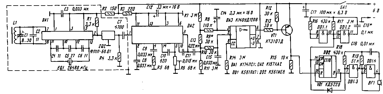 Операционный усилитель DA3 представляет собой компаратор, преобразующий импульсный сигнал малого уровня в импульс с амплитудой, близкой к Uпит. Неинвертирующий вход DA3 отслеживает напряжение источника питания. Сигнал с детектора поступает на инвертирующий вход DA3 через интегрирующую цепь R10C15, которая существенно снижает чувствительность приемника к импульсным помехам. В компараторе особенно важен резистор R9: падение напряжения на нем задает порог срабатывания компаратора. Так, при указанных на схеме номиналах напряжение на резисторе R9 будет равно 30 мВ и компаратор будет реагировать лишь на входные сигналы, амплитуда которых превысит это значение. Устройство, генерирующее тревожный сигнал при исчезновении микропередатчика, содержит задающий генератор на элементах DD1.1, DD1.2 и звуковой генератор (DD1.3, DD1.4). Импульс на входе R счетчика DD2 устанавливает его в нулевое состояние. В счетчик введена блокировка: при появлении высокого уровня на входе CN он перестает реагировать на сигналы, поступающие на вход СР. В этом состоянии создаются условия для периодического возбуждения звукового генератора - он возбуждается лишь при высоком уровне на выходе 10 DD1.1 и высоком уровне на выходе счетчика DD2. Импульсы микропередатчика периодически возвращают счетчик в нулевое состояние. При исчезновении сигналов микропередатчика тревожная сигнализация включится, а при их возобновлении - немедленно прекратится. Магнитная антенна L1 намотана на ферритовом стержне МЗОВН диаметром 8 и длиной 40 мм. Можно использовать отрезок магнитной антенны МЗОВН-Д9001, разломив сердечник по нужному месту после легкого надреза алмазным надфилем. Обмотка имеет 5 витков провода МГШВ-0,15, уложенных в ряд. Резонансная емкость контура Ср и его добротность Q мало зависят от размещения катушки на сердечнике: Ср=32 пф и Q=260 -если она находится в средней части сердечника, Ср=34 пФ и 0=280 - если в 5...6 миллиметрах от края. Частоту кварцевого резонатора ZQ1 рекомендуется выбирать ниже рабочей частоты. В таком случае канал "зеркального" приема оказывается в малозагруженной сетке В диапазона гражданской связи. Резистор R6, от которого зависит чувствительность приемника (она растет с перемещением движка R6 вниз), может быть выполнен как подстроечным, так и переменным - с удобной ручкой. Экран, показанный на рис. 4 штриховой линией, предназначен не столько для защиты радиоприемника от внешних наводок (его чувствительность относительно невелика), сколько внутренних: сигналы с крутыми фронтами, циркулирующие в DD1 и DD2, имеют высокочастотные составляющие, которые при неудачном монтаже могут влиять на приемный тракт. Экран не должен образовывать короткозамкнутого витка на магнитной антенне! Все постоянные резисторы в приемнике-МЛТ-0,125. Типы конденсаторов: С1 -КТ4-23; С12, С17 - К50-35 или К50-40; С14 - К53-30; остальные - КД, КМ6, К10-176 или аналогичные. Излучатель ВП-ЗП-22.