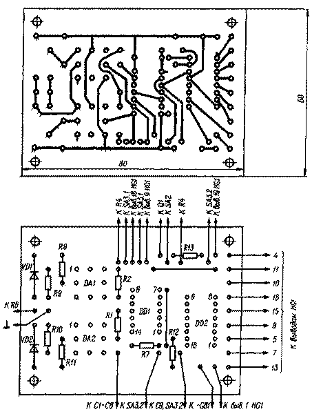 Отметка "X 1 " шкалы резистора R4 ("Время/дел.") соответствует крайнему левому (по схеме) положению движка, а отметка "1В" шкалы резистора R6 ("Уровень") - крайнему верхнему (также по схеме). Остальные детали пробника размешены на печатной плате (рис. 5), изготовленной из фольгированного стеклотекстолита толщиной 1,5 мм. Возможен вариант конструкции, при которой элементы входного делителя напряжения вместе с выключателем SA1 смонтированы в выносном щупе (с таким пробником работать будет удобнее). Налаживание устройства заключается в установке (подбором резисторов R8 и R11) напряжений +100 мВ на выводе 2 ОУ DA1 и -100 мВ на выводе 3 ОУ DA2 относительно средней точки делителя R8-R11, При неустойчивом запуске развертки в ждущем режиме необходимо увеличить емкость конденсатора С9. Повысить яркость свечения сегментов индикатора можно увеличением напряжения питания до 12 В (при этом сопротивление резистора R13 необходимо увеличить до 560 Ом). Работа с пробником требует некоторого навыка. Если необходимо определить лишь наличие импульсов и их длительность, то переменным резистором R6 ("Уровень") устанавливают чувствительность, равную 1 В, переключателем SA2 ("Время/дел.") выбирают такую длительность развертки, при которой на индикаторе отображается один или два периода сигнала, и переменным резистором R4 ("Время/дел.") добиваются устойчивого изображения. Если таким способом синхронизировать изображение не удается, прибор переводят в режим ждущей развертки с запуском положительным или отрицательным перепадом входного напряжения. Период контролируемых колебаний или длительность импульса определяют по положению переключателя SA2 и ручки переменного резистора R4. Если же требуется измерить амплитуду сигнала, ручку переменного резистора R6 и переключатель SA1 устанавливают в положения, соответствующие зажиганию сегментов положительного или отрицательного (в зависимости от полярности сигнала) уровня. Амплитуду (в диапазоне значений. установленных переключателем SA1) отсчитывают по шкале резистора. Форму колебаний определяют по характеру изменения изображения на индикаторе при установке переменным резистором. R6 разных значений чувствительности. В качестве примера на рис. 6 показана отображаемая индикатором информация при поданном на вход сигнале треугольной формы и различных положениях движка переменного резистора R6 (штрихами изображены аноды-сегменты, светящиеся вполнакала).