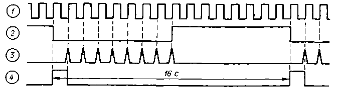 Пока на выходе 8 счетчика DD2.1 низкий логический уровень, импульсы с частотой 1 Гц проходят через коммутатор и обнуляют счетчик DD2.2 (рис. 2, диагр. 2 и 3). При появлении на выходе 8 счетчика DD2.1 высокого логического уровня закрывается диод VD2 и импульсы на вход R счетчика DD2.2 перестают поступать. В момент появления минусового перепада на входе СР счетчика DD2.2 он переходит в единичное состояние и на его выходе 1 появляется высокий логический уровень.
