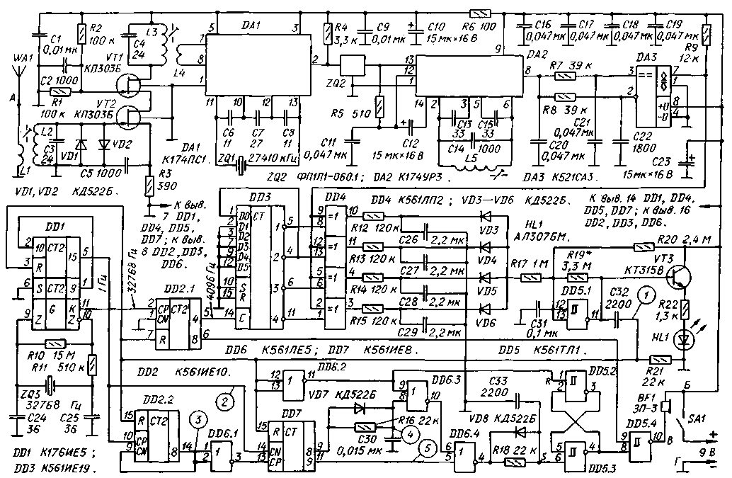 Смеситель выполнен на микросхеме DA1. Она же выполняет и функции гетеродина, частота которого стабилизирована кварцевым резонатором ZQ1. Частота резонатора может быть больше или меньше частоты передатчика на 465 кГц, т. е. либо 26480, либо 27410 кГц. С нагрузки смесителя - резистора R4 - сигнал ПЧ поступает на пьезокерамический фильтр ПЧ ZQ2, обеспечивающий необходимую избирательность приемника. Микросхема DA2 выполняет усиление сигнала, его ограничение и частотное детектирование. Резонансный контур C14L5 частотного детектора настроен на частоту 465 кГц. Демодулированный сигнал частотой 1024 Гц поступает на входы компаратора DA3 через две интегрирующие цепи, отличающиеся значением постоянной времени. На прямой вход сигнал поступает через цепь R7C21, практически полностью подавляющую полезный сигнал, а на инверсный этот сигнал приходит через цепь R8C22 почти без ослабления. Такой узел представляет собой полосовой фильтр. На частоте 1024 Гц он формирует выходную последовательность импульсов, по форме близкую к "меандру", а входные сигналы с частотой, существенно отличающейся от 1024 Гц, на выход практически не проходят. С выхода компаратора DA3 сигнал поступает на вход цифрового узла. Ритм его работы задает генератор на микросхеме DD1, частота которого стабилизирована таким же, как в передатчике, кварцевым резонатором на частоту 32768 Гц. Выходные импульсы генератора с частотой 32768 Гц с выхода К поступают на вход СР счетчика DD2.1 канала контроля частоты, а с частотой 1 Гц с выхода 15 счетчика микросхемы DD1 - на вход СР счетчика DD2.2 и вход CN счетчика DD7 канала контроля временных интервалов. Счетчик DD2.1 формирует импульсы со скважностью 2. Счетчик DD3 - пятиразрядный сдвиговый регистр, который при соединении выхода 2 со входом DO делит частоту импульсов на четыре [4]. При этом на выходах 1 - 4 он формирует сигналы вида "меандр" со сдвигом фазы 0, 90, 180 и 270°. Эти четыре сигнала поступают на нижние по схеме входы элементов DD4.1 - DD4.4, а на верхние входы, соединенные вместе, подан выходной сигнал компаратора DA3. При отсутствии на входе приемника полезного сигнала на выходе компаратора действует шумовое напряжение. После смешения в элементах DD4.1 - DD4.4 с выходными сигналами счетчика DD3 шум усредняют интегрирующие цепи R12C26, R13C27, R14C28, R15C29. В результате напряжение на конденсаторах С26 - С29 равно примерно половине напряжения питания. На входе триггера Шмитта DD5.1 с учетом падения на диодах VD3 - VD6 и резисторе R17 напряжение превышает верхний порог переключения триггера, поэтому на его выходе будет низкий логический уровень. При появлении на выходе компаратора напряжения с частотой 1024 Гц происходит его перемножение элементами DD4.1 - DD4.4 с выходными сигналами счетчика DD3. Если на входах какого-либо из этих элементов фазы сигналов совпадают, на его выходе будет низкий уровень, при противофазных сигналах - высокий, а при близких фазах - импульсы большой скважности, и среднее напряжение этих импульсов близко к нулю. Поэтому примерно через 0,5 с после начала приема полезного сигнала один из конденсаторов С26 - С29, соответствующий тому элементу микросхемы DD4, фазы входных сигналов которого наиболее близки, разряжается практически до нуля. Напряжение на входе триггера Шмитта DD5.1 становится ниже нижнего порога переключения, и на его выходе появляется высокий уровень. Спустя примерно 0,5 с после окончания прием