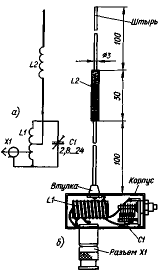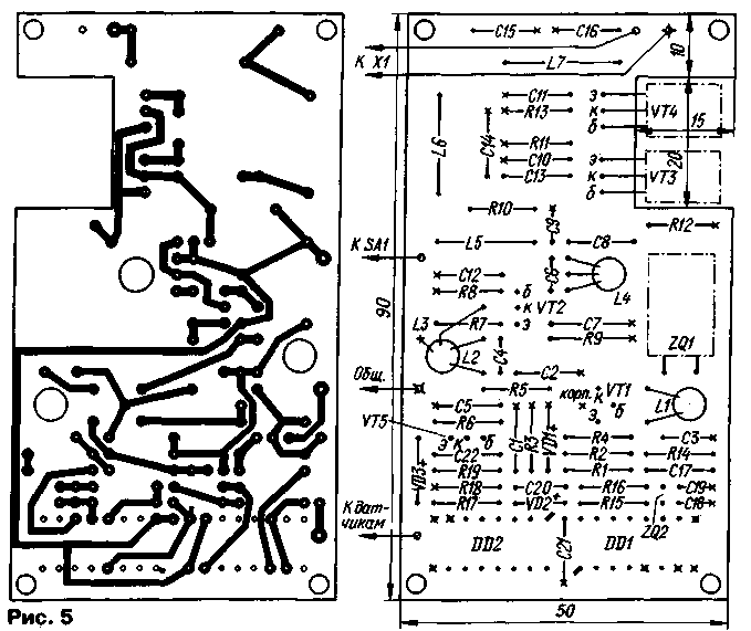 ЭНЦИКЛОПЕДИЯ РАДИОЭЛЕКТРОНИКИ И ЭЛЕКТРОТЕХНИКИ Автомобильный радиосторож. Часть 2. Энциклопедия радиоэлектроники и электротехники Энциклопедия радиоэлектроники и электротехники/ Автомобиль. Охранные устройства и сигнализация Передатчик собран на печатной плате из двустороннего фольгированного стеклотекстолита толщиной 1,5 мм. Чертеж платы представлен на рис. 5. Со стороны компонентов фольга сохранена и служит общим проводом. Часть выводов припаяна к общему проводу без отверстий. Для остальных выводов просверлены сквозные отверстия и со стороны общего провода раззенкованы. Все точки пайки к общему проводу помечены на чертеже крестами. Отверстия под "заземляемые" выводы микросхем зенковать не нужно. В точках соединения платы с антенным разъемом Х1, источником питания и датчиками в отверстия впрессованы и опаяны луженые штыри диаметром 1 мм. В качестве штырей удобно использовать контакты от разъема 2РМ. Транзисторы VT3 и VT4 впаяны со стороны печатных проводников, выводы нужно предварительно отогнуть под прямым углом. При окончательной сборке передатчика транзисторы привинчивают к металлическому кожуху прибора, служащему для них теплоотводом. Изолируют их от кожуха тонкими слюдяными прокладками. В передатчике использованы резисторы МТ и МЛТ, конденсаторы КМ-5 и КМ-6. Транзистор КТ315В можно заменить на любой кремниевый маломощный структуры n-p-n, а транзистор КТ368А - на любой из серий КТ316, КТ325. Вместо КТ646А подойдут транзисторы серий КТ603 и КТ608, но придется преодолевать сложности отведения тепла. Диоды VD2 и VD3 - любые кремниевые маломощные. Варикап KB 110А заменим на КВ109, КВ124, Д901 с любым буквенным индексом. Кварцевый резонатор ZQ1 - стандартный, в металлическом уплощенном корпусе, a ZQ2 - в цилиндрическом миниатюрном корпусе, от наручных часов. Катушки L1, L2L3 и L4 намотаны виток к витку на трех полистироловых каркасах диаметром 5 мм, снабжены подстроечниками из карбонильного железа. Катушка L1 содержит 25 витков провода ПЭВ-2 0,25, катушки L2, L4 -12 витков, a L3 - 3 витка такого же провода. Катушка L3 намотана поверх L2, а L4 имеет отвод от третьего сверху по схеме витка. Дроссель L5 намотан на кольце типоразмера К10х6х3 из феррита 600НН. Обмотка содержит 15 витков провода ПЭВ-2 0,15. Катушки L6 и L7 - бескаркасные, намотаны виток к витку на оправке диаметром 8 мм и содержат по 5 и 9 витков провода ПЭВ-2 0,8 соответственно. Передатчик смонтирован в металлической коробке размерами 110х60х45 мм. На стенках корпуса установлены выключатель питания (SA1), высокочастотный разъем СР-50-73ФВ (Х1) и четырехконтактный разъем 2РМ (на схеме рис. 1 не показан) для подключения источника питания и датчиков. Электрическая схема малогабаритной штыревой спиральной антенны нормального излучения [3], рассчитанной для совместной работы с передатчиком, показана на рис. 6,а, а ее конструкция - на рис. 6,б. На корпусе кабельной колодки разъема СР-50-73ФВ укрепляют небольшую пластиковую коробку (ее размеры некритичны), в которую устанавливают LC-контур, состоящий из катушки L1 и подстроечного конденсатора С1 с воздушным диэлектриком.