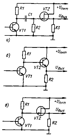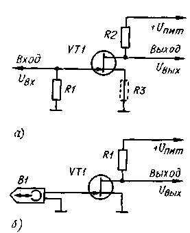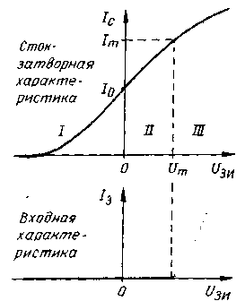 ЭНЦИКЛОПЕДИЯ РАДИОЭЛЕКТРОНИКИ И ЭЛЕКТРОТЕХНИКИ Необычный режим работы полевого транзистора. Энциклопедия радиоэлектроники и электротехники Энциклопедия радиоэлектроники и электротехники / Радиолюбителю-конструктору Традиционная схемотехника линейных усилителей на полевых транзисторах с затвором в виде p-n-перехода (в дальнейшем для краткости называемом p-n-затвором) предусматривает в основном режим, когда рабочая точка находится в области обратного (закрывающего) смещения, т. е. при Uотс<Uзи<0. Вместе с тем, на сток-затворной характеристике транзистора этого класса есть область прямого смещения, при котором ток затвора еще не протекает. Несмотря на то что этот факт известен (cм. книгу П. Хоровица и У. Хил-ла "Искусство схемотехники", т. 1.- М.: Мир, 1986.), режим прямого смещения находит весьма ограниченное применение. Проведенные автором исследования показали, что использование режима, в котором рабочая точка может находиться в зоне открывающего смещения, позволяет существенно упростить схемы узлов на полевых транзисторах. Применение таких схем рационально в тех случаях, когда требование минимальности числа элементов оправдывает необходимость подборки некоторых из них, т. е. в радиолюбительской практике и при разработке особо миниатюрных конструкций. На рис. 1 представлены обобщенные сток-затворная и входная характеристики полевого транзистора с p-n-затвором. На этих вольт-амперных характеристиках - Iс=f(Uвх) и Iз=f(Uвх) - можно выделить три характерных зоны: 1 - закрывающего смещения Uзи, 2 - открывающего смещения, при котором ток затвора практически отсутствует, и 3 - открывающего смещения, обусловливающего существенный ток затвора. Четкой границы между зонами 2 и 3 нет, поэтому для определенности примем в качестве условной границы между ними ординату, соответствующую току затвора 1 мкА - при таком токе сопротивление затвора еще весьма велико, и это значение может быть сравнительно просто измерено. Обозначим также символом Im ток стока на этой границе и прямое напряжение на затворе Um. При напряжении Uзи, большем граничного, ток затвора начинает резко увеличиваться и полевой транзистор теряет свое основное достоинство - высокое входное сопротивление. Поэтому работу в зоне 3 не рассматриваем. Из изложенного ясно, что нет необходимости полностью исключать работу полевого транзистора в зоне прямого смещения, вполне достаточно, чтобы рабочая точка не переходила в зону 3, т. е. было выполнено условие Uзи<Um. Более того, принципиально возможна работа усилителен на транзисторе с прямым начальным напряжением на затворе. Проведенные исследования полевых транзисторов различных типов показали, что их напряжение Um в основном зависит от типа и в значительно меньшей степени от конкретного экземпляра. Оно находится в пределах от 0,3 В для КП302ГМ до 0,55 В для КП303А. Несмотря на то, что расширение рабочего интервала напряжения Uзи из-за добавления зоны прямого смещения по абсолютной величине невелико, оно имеет очень важное значение, поскольку позволяет несколько иначе подойти к схемотехнике полевых транзисторов. Как видно из рис. 1, сток-затворная характеристика переходит в зону 2 плавно, без излома. Суть физических процессов в транзисторе заключается в том, что при подаче на затвор прямого напряжения смещения происходит расширение канала и проводимос