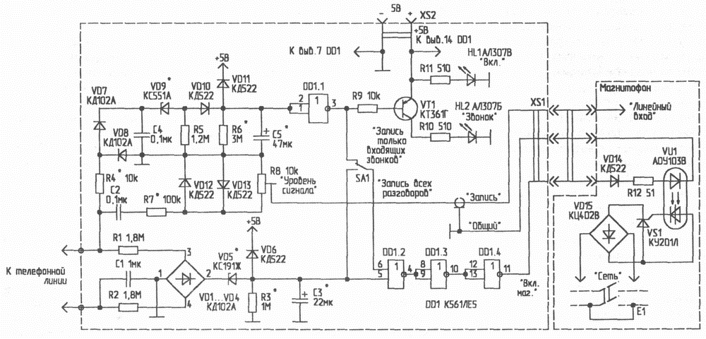 Поступающий из телефонной линии через резистор R4 звонок с напряжением 60...90 В выпрямляется выпрямителем с удвоением напряжения на диодах VD7, VD8 и конденсаторе С4. Вызывное напряжение понижается стабилитроном VD9 до напряжения питания и заряжает конденсатор С5. На выходе 3 элемента DD1.1 формируется низкий логический уровень, который через переключатель SA1 поступает на вход 6 элемента DD1.2. При этом открывается транзистор VT1, и загорается светодиод индикации вызова HL2. После того как АОН "поднимет" трубку, напряжение в линии упадет до 9...12 В, и стабилитрон VD5 закроется. Начинается разряд конденсатора C3 через резистор R3. При достижении на выводе 5 DD1.2 низкого уровня, на выходе 4 появляется логическая "1", которая переключает элементы DD1.3, DD1.4 и подает управляющее напряжение высокого уровня через разъем XS1 на узел включения магнитофона. Конденсатор C3 и резистор R3 обеспечивают задержку включения магнитофона, необходимую для исключения ложных срабатываний при наборе номера и записи на магнитофон фразы, выдаваемой абоненту АОНом. Сигнал на линейный вход магнитофона подается через конденсатор С2 и регулируемый резистивный делитель R7-R8. Диоды VD12, VD13 защищают линейный вход магнитофона, понижая вызывное напряжение до безопасного уровня. Как только абонент на другом конце провода положит трубку, короткие сигналы "занято" заставят АОН снять удержание линии, и напряжение в ней вновь вернется к первоначальному уровню (60 В), обеспечивая появление на входе 5 элемента DD1.2 высокого уровня и его переключение в исходное состояние. В случае, если по каким-либо причинам абонент или АОН не "положат" трубку в течение нескольких минут, продолжительность записи будет ограничена временем разряда конденсатора С5 через резистор R6. Диод VD10 служит для исключения шунтирующего влияния нагрузочного резистора R5 при разряде конденсатора С5 через резистор R6. Диоды VD11 и VD6 стабилизируют уровень зарядного напряжения на конденсаторах C3 и С5, обеспечивая таким образом постоянство временных интервалов срабатывания устройства. Переключателем SA1 можно отключить узел блокировки записи исходящих вызовов, если возникнет необходимость записи всех разговоров. Светодиод HL2 по-прежнему будет индицировать поступающие звонки. Для успешной работы с предлагаемым устройством, магнитофон должен быть доработан. Автором использовался магнитофон-приставка "Радиотехника МП-7301". В магнитофон был вмонтирован узел управления, собранный по стандартной схеме [4]. Поступающее через разъем XS1 напряжение высокого уровня через тиристорный оптрон VU1 открывает тиристор VS1, замыкающий диагонали диодного моста VD15, подключенного параллельно сетевому выключателю магнитофона. Контакт сетевого выключателя магнитофона должен быть замкнут перемычкой Е1. Магнитофон, предварительно установленный на запись (установлена кассета, отрегулирован уровень записи, нажаты клавиши "Воспроизведение" и "Запись") включается по сигналу вызова и начинает записывать информацию, поступающую из телефонной сети. Если магнитофон снабжен автостопом, то в режиме записи он должен быть заблокирован, так как при отключении от сети после записи первого сообщения, автостоп отключит клавиши записи и воспроизведения, и следующее сообщение уже не запишется. Для этого в магнитофон устанавливается дополнительная кнопка (например, от