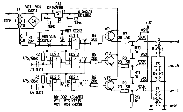 Устройство состоит из блока питания и генератора импульсов положительной полярности на трансформаторе Т1. В блок питания входят обмотка II трансформатора Т1, выпрямительный мост VD1 ...VD4 и стабилизатор DA1. Генератор импульсов собран на обмотке III трансформатора Т1, резисторе R1 и выпрямителе на диодах VD5, VD6. Стабилитрон VD7 защищает входы элемента DD1.1 от случайного превышения напряжения более 12 В. На элементе DD1.1 собран формирователь прямоугольных импульсов. Можно применить и компаратор, подробно описанный в [6]. На выходе формирователя DD1.1 присутствуют импульсы прямоугольной формы частотой 50 Гц положительной полярности. Предположим, что это импульсы напряжения Uа (рис.1). Импульсы с выхода "А" элемента DD1.1 подаются на вход схемы задержки, собранной на элементах DD2.1, DD2.2. R2, С3. На выходе элемента DD2.2 появляются импульсы, задержанные на 1/3 периода относительно импульсов "А", т.е. импульсы "В". Импульсы "В" подаются на вход второй схемы задержки на элементах DD2.3, DD2.4, R3, С4, на выходе которой (элемент DD2.4) присутствуют импульсы, соответствующие напряжению Uс на рис.1, сдвинутые на 1/3 периода относительно "Uв". Импульсы "А", "В", "С", сдвинутые друг относительно друга на 6,666... мс, поступают на ключевые каскады VT1, VS 1; VT2, VS2 и VT3, VS3 соответственно. С выходов ключей (симисторов VS1...VS3) импульсное напряжение частотой 50 Гц подается на обмотки трансформаторов Т2...Т4. С выходных обмоток трансформаторов получаем синусоидальные напряжения, сдвинутые на 1/3 периода или на 120° одно относительно другого, т.е. трехфазное напряжение. Детали и регулировка схемы. Формирователь прямоугольных импульсов можно выполнить по любой из известных схем. Вместо диодов VD1...VD4 можно применить мост КЦ405. Симисторы VS1...VS3 заменяются тиристорами КУ202, т.к. на их входы подается постоянное напряжение. Постоянная времени т RC-цепей R2, С3 и R3, С4 рассчитана по формуле T=1,4RC. Приняв емкость конденсаторов C3, С4 равной 0,01 мкФ, находим сопротивление резисторов R2, R3, которое составляет 476,186 к. При этом постоянная времени т составляет 6,666604 мс, что практически равно сдвигу на 1/3 периода. Для более точной подгонки т RC-цепей резисторы R2, R3 состоят из последовательно соединенных постоянного и подстроечного резисторов общим номиналом около 510 к. Подстроечным резистором подгоняют т RC-цепей, контролируя сдвиг фаз на выходах трансформаторов Т2...Т4 фазометром, так чтобы сдвиг фаз оказался как можно ближе к 120°. При трансформации трехфазного тока используются либо три однофазных, либо специальные трехфазные трансформаторы с сердечником в форме трех закороченных стержней. Схема соединения отдельных трансформаторов (рис.3) соответствует схеме включения "звезда/звезда". Такое соединение показано на рис.3 [7].