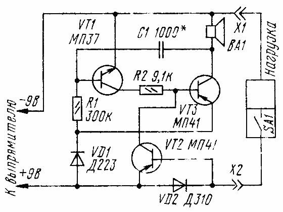 На транзисторе VT2 и трансформаторе Т1 собран по схеме индуктивной трехточки генератор колебаний звуковой частоты. Конденсатор С1 совместно с первичной обмоткой трансформатора определяет высоту тона, воспроизводимого динамической головкой ВА1. Работой автогенератора управляет каскад на транзисторе VT1, у которого переход коллектор-эмиттер включен между базой транзистора VT2 и плюсом блока питания. Диод VD2, включенный параллельно эмиттерному переходу транзистора VT1, стоит в цепи питания нагрузки. Другой диод-VD1 стоит в цепи эмиттера транзистора VT2.