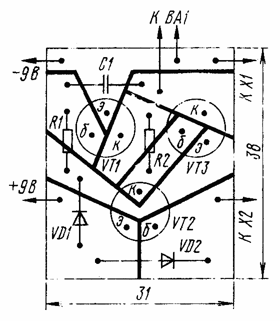 Детали сигнализатора хорошо монтировать на печатной плате из фольгированного стеклотекстолита (рис. 2). Толстыми линиями на чертеже обозначены прорези в фольге, изолирующие печатные проводники друг от друга. Конечно, плату можно изготовить методом травления, но тогда понадобится хлорное железо.