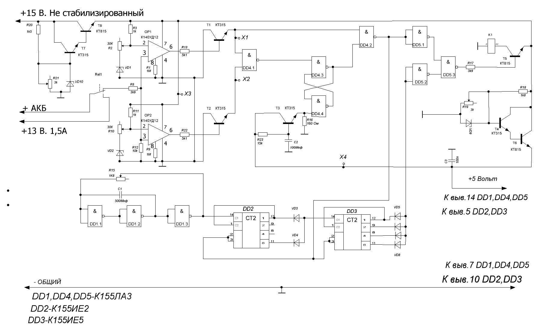 Äëÿ óäîáñòâà â íàñòðîéêå ïðèáîðà ÿ âñòðîèë òóäà êîíòðîëüíûå òî÷êè( Õ1,Õ2,Õ3,Õ4).Íà òî÷êå Õ3 äîëæíî áûòü +15 Âîëüò. Íàòî÷êå Õ4 äîëæíî áûòü íàïðÿæåíèå +5 Âîëüò, åãî ìîæíî ïîäñòðîèòü ñ ïîìîùüþ ïåðåìåííîãî ðåçèñòîðà R19.Íàïðÿæåíèå íà òî÷êå Õ1 ÿâëÿåòñÿ ïîðîãîâûì äëÿ îòêëþ÷åíèÿ çàðÿäêè ÀÊÁ. Åãî ìîæíî ïîäñòðîèòü ñ ïîìîùüþ ïåðåìåííîãî ðåçèñòîðà R2 (ÿ óñòàíîâèë òàì íàïðÿæåíèå 12,5 Âîëüò). Íàïðÿæåíèå íà òî÷êå Õ2 ÿâëÿåòñÿ ïîðîãîâûì äëÿ íà÷àëà çàðÿäêè ÀÊÁ. Åãî ìîæíî ïîäñòðîèòü ñ ïîìîùüþ ïåðåìåííîãî ðåçèñòîðà R10 (ÿ óñòàíîâèë òàì íàïðÿæåíèå 11,5 Âîëüò). Äëÿ íàñòðîéêè ïîðîãîâ ñðàáàòûâàíèÿ ïðèáîðà ìîæíî èñïîëüçîâàòü ìàëîìîùüíûé ÁÏ ñ ðåãóëèðóåìûì âûõîäíûì íàïðÿæåíèåì 10-14 âîëüò. Íà åãî âûõîä íàäî ïîñòàâèòü äèîä è ïîäêëþ÷èòü åãî âìåñòî ÀÊÁ.