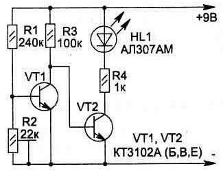 îñíîâå ïîñòðîåíèÿ ïðèâåäåííûõ íèæå ñõåì ïðèìåíåí èíäèêàòîð óðîâíÿ íàïðÿæåíèÿ íà òðàíçèñòîðå (VT1) ðàáîòàþùåì â ðåæèìå ìèêðîòîêîâ. Ïðè ýòîì ó òðàíçèñòîðà î÷åíü áîëüøîé êîýôôèöèåíò óñèëåíèÿ è ïðè èçìåíåíèè íàïðÿæåíèÿ ïèòàíèÿ íà 0,1  îí ïåðåêëþ÷àåòñÿ èç çàïåðòîãî ñîñòîÿíèÿ â îòêðûòîå.