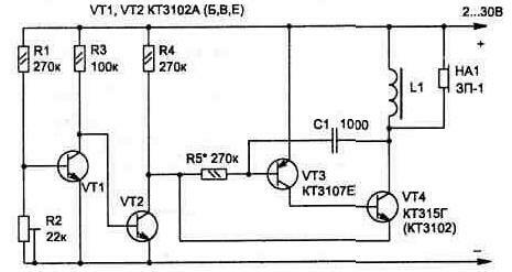 Íà ðèñ. 5.21 ïðèâåäåíà ñõåìà çâóêîâîãî ñèãíàëèçàòîðà íà ïüåçîèçëó÷àòåëå HF1 (ÇÏ-1 èëè ëþáîì àíàëîãè÷íîì). Óðîâåíü êîíòðîëèðóåìîãî íàïðÿæåíèÿ ìîæåò áûòü îò 2 äî 30 Â, íî ïðè èñïîëüçîâàíèè ñõåìû ñ íàïðÿæåíèåì áîëåå 9  íåîáõîäèìî ïîäîáðàòü âåëè÷èíó ðåçèñòîðà R5, äëÿ òîãî ÷òîáû ñõåìà, ïðè äîñòàòî÷íîé ãðîìêîñòè çâóêà ïüåçîèçëó÷àòåëÿ, â ðåæèìå ñèãíàëèçàöèè ïîòðåáëÿëà òîê íå áîëåå 1... 2 ìÀ. ×àñòîòà çâóêà çàâèñèò îò êîíäåíñàòîðà Ñ1, è åå ìîæíî èçìåíèòü.