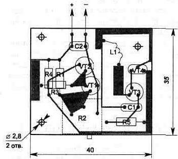 Êàòóøêà L1 ñîäåðæèò 600 âèòêîâ ïðîâîäà ÏÝ äèàìåòðîì 0,08 ìì (0,1 èëè 0,12 ìì), íàìîòàííûõ íà ñêëååííûõ êëååì äâóõ êîëüöàõ òèïîðàçìåðà Ê10õ6õ3 ìì èç ôåððèòà 600ÍÌ1 èëè 1000ÍÌ1. Òîïîëîãèÿ ïå÷àòíîé ïëàòû ïîêàçàíà íà ðèñ. 5.22.