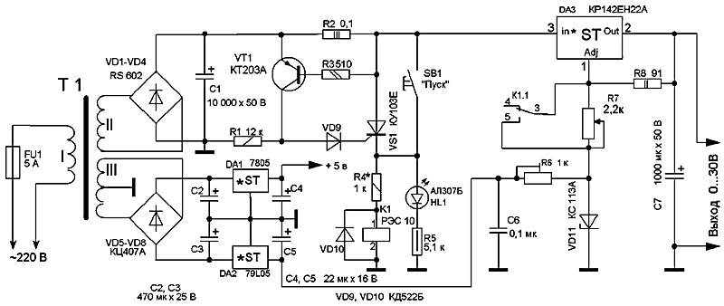 Возможности по току у микросхемы КР142ЕН12А ограничены 1,5 А. В настоящее время в продаже имеются микросхемы с аналогичными параметрами, но рассчитанные на больший ток в нагрузке, например LM350 - на ток 3 A, LM338 - на ток 5 А. Данные по этим микросхемам можно найти на сайте National Semiconductor [1]. В последнее время в продаже появились импортные микросхемы из серии LOW DROP (SD, DV, LT1083/1084/1085). Эти микросхемы могут работать при пониженном напряжении между входом и выходом (до 1...1,3 В) и обеспечивают на выходе стабилизированное напряжение в диапазоне 1,25...30 В при токе в нагрузке 7,5/5/3 А соответственно. Ближайший по параметрам отечественный аналог типа КР142ЕН22 имеет максимальный ток стабилизации 7,5 А. При максимальном выходном токе режим стабилизации гарантируется производителем при напряжении вход-выход не менее 1,5 В. Микросхемы также имеют встроенную защиту от превышения тока в нагрузке допустимой величины и тепловую защиту от перегрева корпуса. Данные стабилизаторы обеспечивают нестабильность выходного напряжения 0,05%/В, нестабильность выходного напряжения при изменении выходного тока от 10 мА до максимального значения не хуже 0,1 %/В. На рис. 4 показана схема БП для домашней лаборатории, позволяющая обойтись без транзисторов VT1 и VT2, показанных на рис.2. Вместо микросхемы DA1 КР142ЕН12А применена микросхема КР142ЕН22А. Это регулируемый стабилизатор с малым падением напряжения, позволяющий получить в нагрузке ток до 7,5 А.