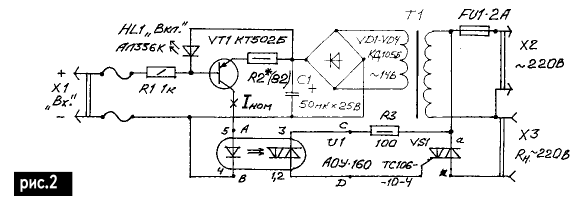 Во втором варианте применяем оптрон с выходом на транзисторе, добавляем усилитель тока на транзисторе VT1, резистор R1 и диодный мост VD1-VD4 (рис.4,б). Если оптроны, вообще, не удается достать, то этот узел можно реализовать на электромагнитном реле, лучше всего герконовом типа РЭС-55 (рис.4,в). Можно использовать геркон типа КЭМ-2А, намотав на каркасе длиной, равной длине геркона, и высотой щек 4 мм обмотку с сопротивлением не менее 500 Ом. Вместо оптрона с симистором можно применить современный силовой оптрон серии 5П19. Использование этих вариантов потребует увеличения объема, при этом розетку Х3 придется вынести из корпуса, а штатную плату переделать. В результате проделанной работы получается универсальный очень удобный и безопасный силовой коммутатор переменного тока. В заключение несколько слов о безопасности. Схемотехникой и конструкцией предусмотрен ряд мер по обеспечению защиты от поражения электрическим током (полная двойная гальваническая развязка) и по пожарной безопасности при перегрузках (предохранитель на ток 2 А). Однако монтаж выполнен в ограниченном объеме, и поэтому особую аккуратность и внимание следует уделить вопросам изоляции и выбора материалов и элементов конструкции (оптроны следует применять только с напряжением изоляции более 500 В). Если есть сомнения в качестве изделий (например, трансформатора), то их следует проверить в электролаборатории испытательным напряжением 1500 В. То же самое стоит проделать и с готовой конструкцией (проверить развязку между низковольтной и высоковольтной частями). Помните, что от этого зависит Ваша жизнь! Автор: Ю.П.Саража