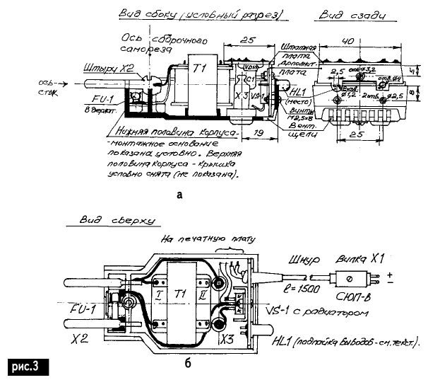 Дальше вывинчиваем саморез и снимаем крышку корпуса, при этом трансформатор должен остаться на основании выводами вверх, причем на выводы вторичной обмотки напаяна печатная плата выпрямителя (рис.3,б). Теперь нужно снять печатную плату с выводов трансформатора, используя паяльник с отсосом припоя или медицинскую иглу со сточенным срезом, и очистить отверстия, чтобы при сборке плата легко надевалась на выводы трансформатора. Штатная печатная плата подвергается небольшой доработке: один из диодов моста, который стоял вдоль платы, переставляем поперек и получаем двахдва диода параллельно для того, чтобы сместить конденсатор С1 ближе к трансформатору и освободить немного объема для установки симистора VS1. В монтажной схеме используем также штатный шнур, штатный штеккер которого заменяем на вилку СЮП-в (см. "РА" 2/99, стр.22). Конденсатор С1 нужно изолировать (обмотать корпус скотчем в несколько слоев или применить импортный с изоляцией корпуса и меньшими габаритами). Теперь извлечем лишние детали: стабилитрон КС136А и резистор 1,5 кОм и прочистим отверстия. Третьей лишней деталью является П-образная картонка, которая входила в крепление шнура. Для того чтобы более надежно закрепить шнур, установить светодиод HL1 и симистор VS1 (в корпусе ТО-220) нужно изготовить дополнительную печатную плату размером 25х40 мм (такой же размер имеет и основная плата). Эта плата показана на рис.3,а (вид сзади). Для повышения качества советую сверлить отверстия в такой последовательности: отверстие под светодиод (упомянуто выше), крепежные отверстия платы диаметром 2,5 мм сначала тонким сверлом в корпусе, а затем в заготовке рассверливаем до указанного диаметра. Собираем дополнительную плату с корпусом винтами длиной 8 мм, причем между платой и корпусом нужно установить распорные шайбы толщиной 1,3 мм (между корпусом и платой должен быть зазор). Отверстия под выводы светодиода (диаметром 1,2 мм) и отверстие для пропуска шнура (диаметром 4 мм) сверлим на оси стыка (рис.3,а вид сзади). Отверстие для крепления симистора VS1 (диаметром 3,2 мм) сверлим последним и под него подбираем винт М3 с низкой головкой (этот винт должен спрятаться под крышкой корпуса). Во время описанных процедур не забудьте проверить положение верхнего торца дополнительной платы и, если нужно, подпилите его так, чтобы при установке штатной платы их стык был параллелен стыку корпуса. На дополнительной плате нитрокраской наносим: 1) по центру прямоугольник под симистор шириной 14 мм на всю высоту платы (при монтаже симистора на нее напаиваем небольшой радиатор из меди толщиной 0,5 мм и размерами 25х25 мм с отгибом по двум сторонам); 2) вокруг отверстий крепления платы площадки 6х6 мм, на которые нужно напаять гайки М2,5; 3) несколько выше, но не на самом верхнем крае, две площадки под выводы светодиода (площадки отнесены на 5 мм от отверстий под выводы, чтобы исключить перегрев светодиода при пайке); 4) по краям платы (отступив от верхнего края 3 мм) по 4 контактных площадки 3х3 мм для монтажа элементов схемы. После этого плату можно протравить. Предохранитель FU1 устанавливаем в отсеке в зоне штырей сетевой вилки (рис.3). Вставку керамическую длиной 15 мм устанавливаем в самодельный держатель, подпаянный на плату размером 10х20 мм с контактными площадками по краям (плату можно протравить вместе с дополнительной). Подбираем роз