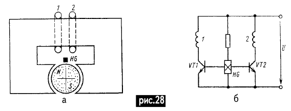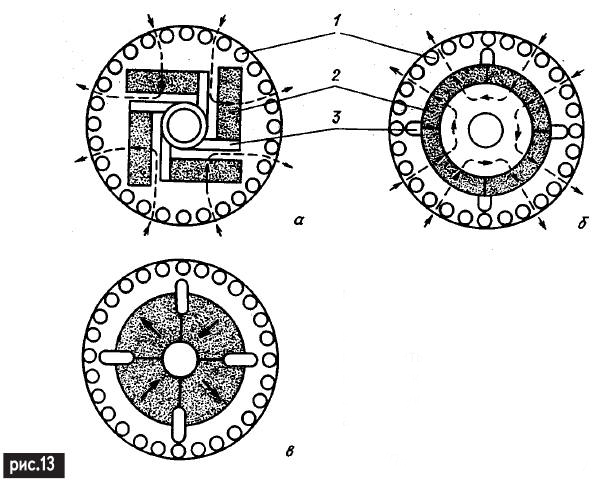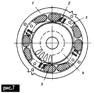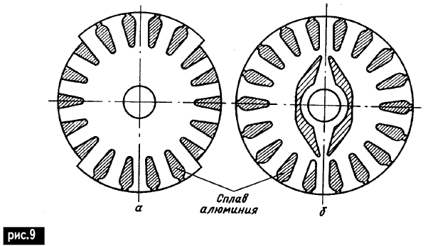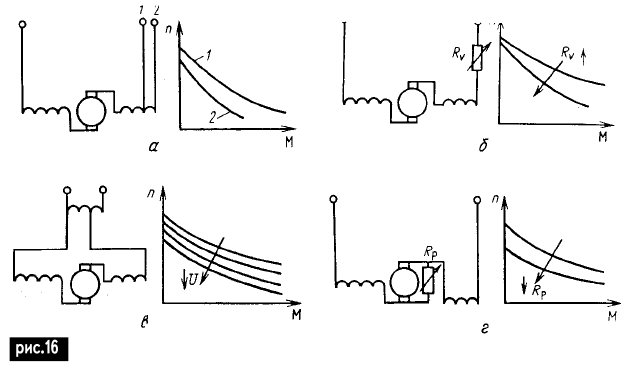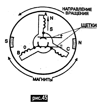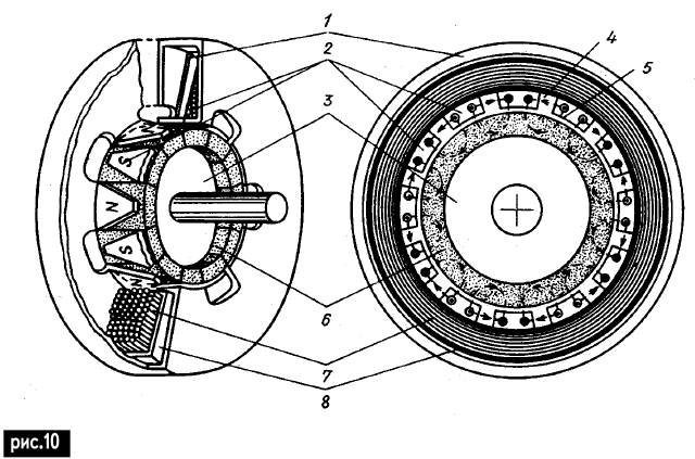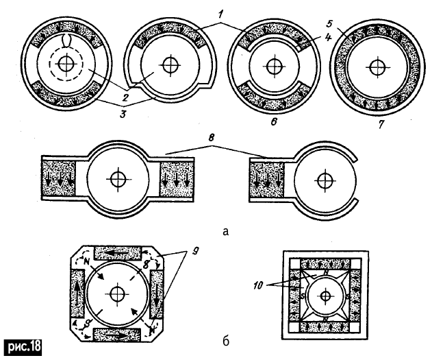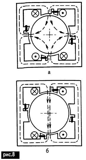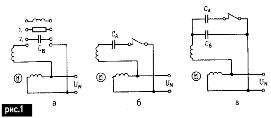 ЭНЦИКЛОПЕДИЯ РАДИОЭЛЕКТРОНИКИ И ЭЛЕКТРОТЕХНИКИ Электрические микродвигатели. Энциклопедия радиоэлектроники и электротехники Энциклопедия радиоэлектроники и электротехники / Электродвигатели Обычно электрические двигатели делят на три группы: большой, средней и малой мощностей. Для двигателей малой мощности (будем называть их микродвигателями) верхнюю границу мощности не устанавливают, обычно это несколько сот ватт. Микродвигатели широко используют в приборах и аппаратах бытового назначения (сейчас в каждой семье имеется несколько микродвигателей - в холодильниках, пылесосах, магнитофонах, проигрывателях и пр.), измерительной технике, системах автоматического регулирования, авиации и космической технике и других областях человеческой деятельности. Первые электродвигатели постоянного тока появились еще в 30-е годы ХIX столетия. Большой шаг в развитии электродвигателей был сделан в результате изобретения в 1856 г. немецким инженером Сименсом двухякорного преобразователя и открытия им в 1866 г. динамоэлектрического принципа. В 1883 г. Тесла, а в 1885 г. Феррари независимо друг от друга изобрели асинхронный двигатель переменного тока. В 1884 г. Сименс создал коллекторный двигатель переменного тока с последовательной обмоткой возбуждения. В 1887 г. Хазельвандер и Доливо-Добровольский предложили конструкцию ротора с короткозамкнутой обмоткой типа "беличья клетка", что существенно упростило конструкцию двигателя. В 1890 г. Хитин и Лебланк впервые использовали фазосдвигающий конденсатор. В бытовых электроприборах электродвигатели начали использовать с 1887 г. - в вентиляторах, с 1889 г. - в швейных машинах, с 1895 г. - в бормашинах, с 1901 г. - в пылесосах. Однако к настоящему времени потребность в микродвигателях оказалась настолько большой (в современной видеокамере используется до шести микродвигателей), что возникли специализированные фирмы и предприятия по их разработке и производству. Разработано большое количество типов микродвигателей, каждому из которых посвящена статья из данной серии. Асинхронные микродвигатели Однофазные асинхронные микродвигатели являются наиболее распространенным типом, они удовлетворяют требованиям большинства электроприводов приборов и аппаратов, отличаясь низкой стоимостью и уровнем шума, высокой надежностью, не требуют ухода и не содержат подвижных контактов. Включение. Асинхронный микродвигатель может быть с одной, двумя или тремя обмотками. В однообмоточном двигателе нет начального пускового момента, и для его запуска нужно использовать, например, пусковой двигатель. В двухобмоточном двигателе одна из обмоток, называемая главной, непосредственно подключается к питающей сети (рис.1). Для создания пускового момента в другой, вспомогательной, обмотке должен протекать ток, сдвинутый по фазе относительно тока в главной обмотке. Для этого последовательно со вспомогательной обмоткой включают дополнительный резистор, который может иметь активный, индуктивный или емкостной характер. Наиболее часто в цепь питания вспомогательной обмотки включают конденсатор, получая при этом оптимальный угол сдвига фаз токов в обмотках, равный 90° (рис.1,б). Конденсатор, постоянно включенный в цепь питания вспомогательной обмотки, называется рабочим. Если при запуске двигателя необходимо обеспечить повышенный пус