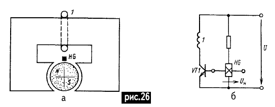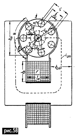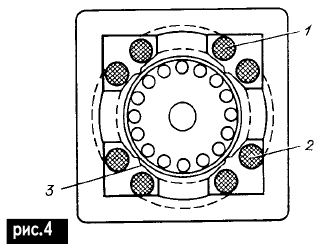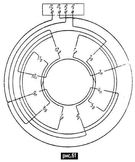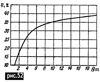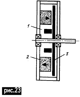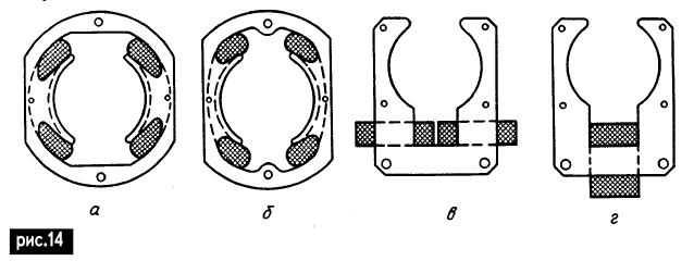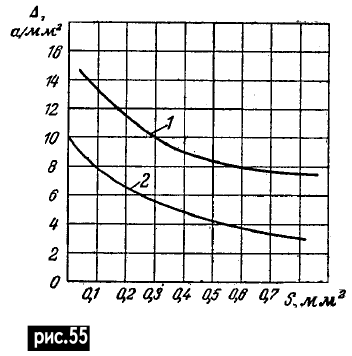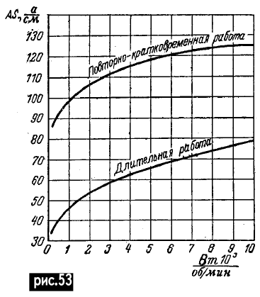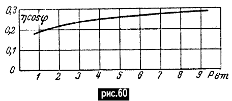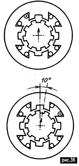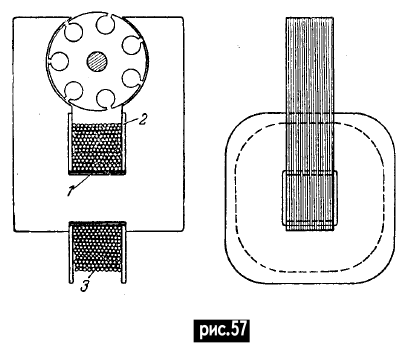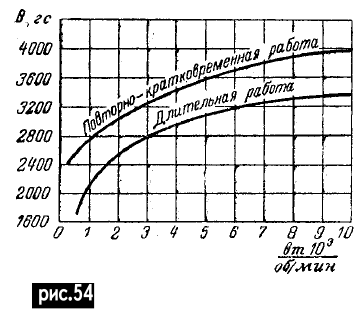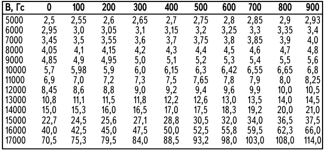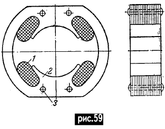 Для расчета н.с. на две высоты зубца надо Hz умножить на двойную высоту зубца Iwz = Hz 2hz. В таблице в вертикальной графе отложена магнитная индукция, выраженная в тысячах гаусс, а в горизонтальной строке - в сотнях гаусс. Если, например, индукция равна 10500 Гс, то нужное значение напряженности поля находят на пересечении строки 10000 и столбца 500 (в данном случае 6,3). Намагничивающую силу можно определить, умножив напряженность на длину силовой линии. При расчете индукции в сердечнике якоря следует учесть, что магнитный поток в нем разветвляется, и поэтому на одно сечение приходится только половина потока. Сечение сердечника якоря (по рис.58) равно расстоянию ha от основания паза до вала, умноженному на длину якоря ha = D/2 - hz - db/2. Также нужно учесть изоляционные прослойки между листами. Таким образом, индукция в сердечнике якоря Ba = Ф/(2hal 0,9). Этой индукции по вышепрведенной таблице соответствует Ha. Намагничивающая сила сердечника якоря Iw = H La, где La - длина силовой линии в сердечнике согласно рис.58: La = п(D - 2hz - ha)/2 (см). Как видно на рис.58, у этого двигателя нет выступающих полюсов, которые слились со станиной. Поэтому расчет неподвижной части магнитопровода сводится к расчету станины. Ширину станины определяем по заданной индукции В = 5000 Гс. Отсюда bcm = Фcm/5000 х l х 0,9 (см). Напряженность поля Нсm для индукции 5000 Гс находим в табл.2. При определении длины силовой линии в станине встречается затруднение. Ведь длина боковой стороны станины зависит от толщины катушки, а она неизвестна. Поэтому возьмем толщину катушки, равную 30 значениям воздушного зазора. Определив по эскизу длину силовой линии в станине Lст, рассчитаем намагничивающую силу (н.с.) для станины Iwcт = Lcт Нcт. Теперь сложим н.с. всех участков Iw0 = Iwd + Iwz + Iwa + Iwcт . Такую н.с. должна создать катушка при холостом ходе двигателя, но при нагрузке появится размагничивающее действие магнитного поля якоря. Поэтому нужен запас, который подсчитаем по формуле Iwp = 0,15 t AS (А-витков). (10) Число витков катушки можно подсчитать по сумарной Iw: w = Iw/I. Для определения сечения провода нужно ток разделить на плотность тока (определяем по кривой 2 рис.55. По таблицам справочника "Радиокомпоненты и материалы" находим ближайшее стандартное сечение и диаметр провода в изоляции dиз. Площадь, занимаемая витками катушки, F = wdиз2/kз (kз - коэффициент заполнения). Разделим площадь F на длину катушки (на эскизе lк) и получим ее ширину bк = F/lк. Пример расчета двигателя постоянного тока Номинальные данные двигателя: Р = 5 Вт, U = 12 В, n = 4000 об/мин. По кривой рис.52 определяем КПД двигателя 30%, по формуле (2) - расчетную мощность двигателя Ра = 5 (1 + 2х0,3)/3х0,3 = 8,9 Вт. Для нахождения значений AS и В по кривым рис.53 и 54 вычислим отношение мощности двигателя, выраженной в милливаттах, к скорости вращения 5000/4000 = 1,25. По рис.53 находим AS = 50 A/см. Аналогично по рис.54 находим индукцию в воздушном зазоре В = 2200 Гс. Примем отношение l/D = 1. Подставим численные значения расчетных величин в формулу (6) и найдем диаметр якоря D=(8,9х109/1,1х50х2200х4000)1/2 = 2,6 см. При k = 1 длина якоря l = 2,61 = 2,6 см. Ток якоря по формуле (3) I = 5/0,3х12 = 1,4 А. ЭДС обмотки якоря по формуле (4) Е = 3,14 2,6/1,4 = 6,3 В. Полюсное деление якоря t = 3,14х2,6/2 = 4,1 см. Магнитный поток по формуле (7) Ф = 0,65х4,1х2,6х2200 = 15200. Число проводников обмотки якоря по формуле (8) N= =6,3х60х108/15200х4000 = 620. Число пазов якоря z = 3х2,6 = 7,8. Округляем до ближайшего нечетного числа z = 7. Число про