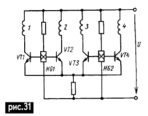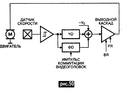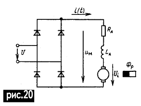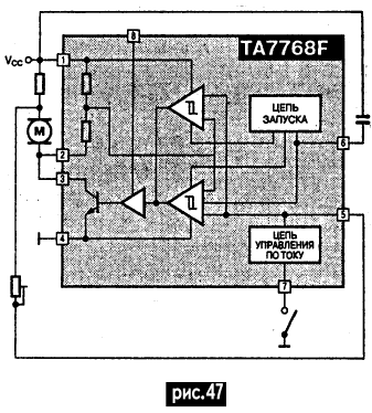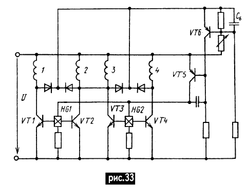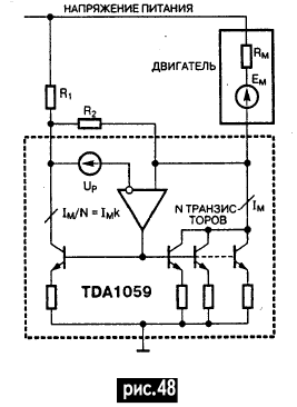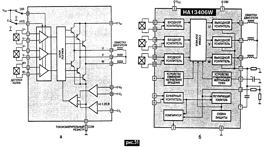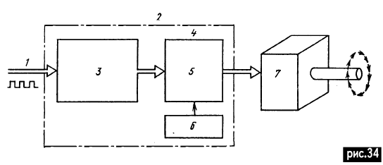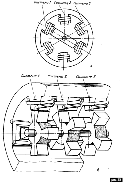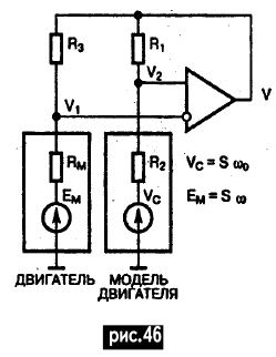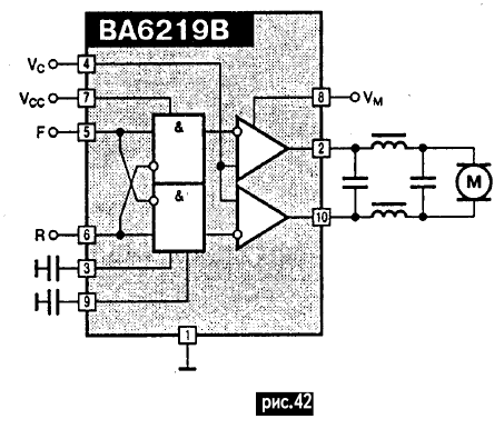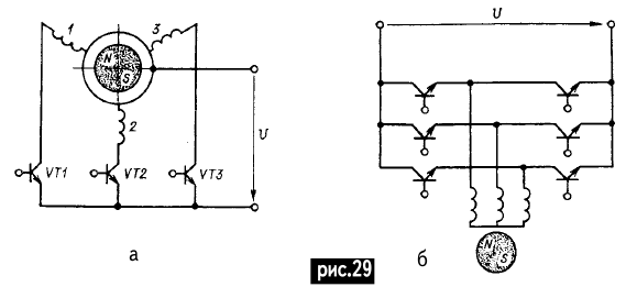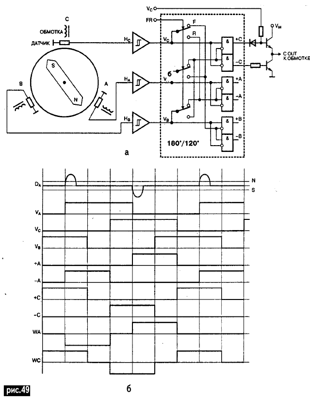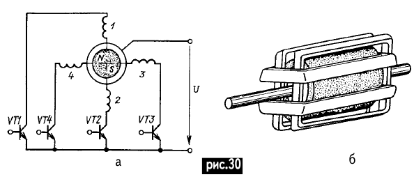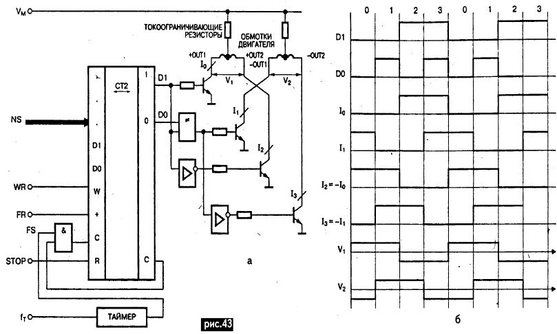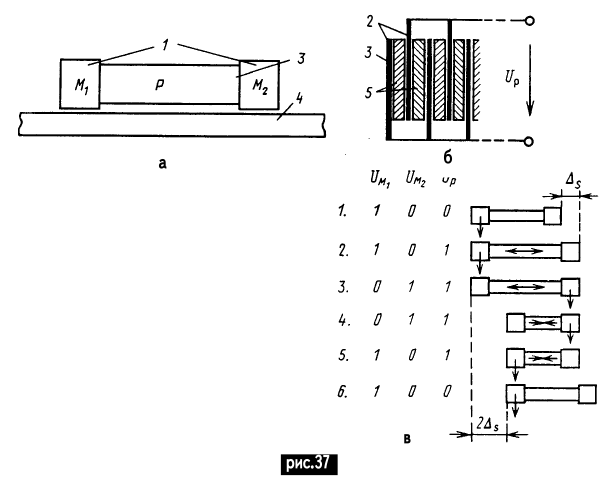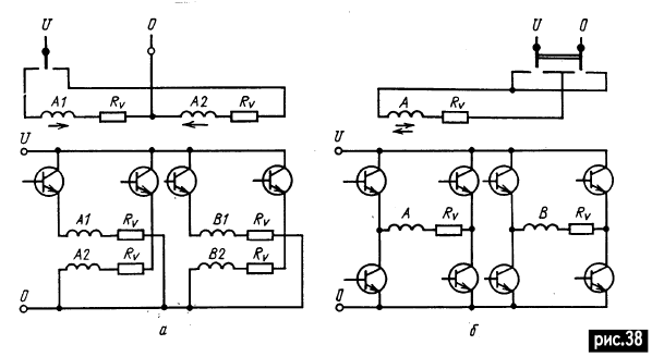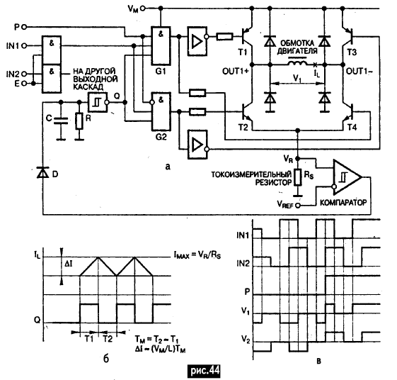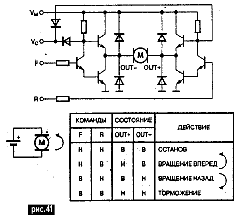 Шаговые двигатели могут обеспечивать не только вращательное, но и поступательное движение механизма электропривода. Такие шаговые двигатели называются линейными. Они используются, например, для позиционирования различных устройств на плоскости X-Y, при этом перемещение по каждой координате осуществляется с помощью отдельной обмотки. Кроме электромагнитных линейных шаговых двигателей существуют пьезоэлектрические. На рис.37,а показана схема такого двигателя. В его конструкцию входят два электромагнита М1 и М2 (1), которые могут скользить по стальной балке 4, и пьезоэлектрический трос 3. Конструкция пьезоэлектрического троса поясняется на рис.37,б. Если на электроды 2 подать напряжение, то в зависимости от его полярности элементы троса 5 сожмутся или растянутся. При подаче напряжения на обмотки электромагнитов они зафиксируются на стальной балке. На рис.37,в показаны последовательность импульсов напряжения, подаваемых на обмотки электромагнитов и на электроды пьезоэлектрического троса, а также процесс перемещения электромагнитов. Схемы управления. На рис.38 изображены схемы управления шаговыми двигателями, в которых реализуются два основных способа управления - униполярный и биполярный. При униполярном управлении (рис.38,а) используется двухпакетный шаговый двигатель, на каждом пакете статоров А и В которого расположены по две обмотки А1, А2 и В1, В2. Обмотки каждого пакета образуют пару полюсов и создают намагничивающую силу разного знака. На рис.39 приведена схема включения двигателя с гибридным ротором. Кольцевая обмотка каждого пакета статора с когтеобразными полюсами содержит две полуобмотки. Схема управления рис.38,а отличается простотой, но при этом ухудшается использование двигателя, так как в работе находится только одна из двух обмоток статора. При биполярном управлении (рис.38,б) использование двигателя повышается, хотя одновременно усложняется и схема управления. Поэтому такой способ управления используется в электродвигателях с повышенными требованиями к массогабаритным показателям. Управление электродвигателями Уравнения, описывающие двигатель по каждой фазе, имеют вид: Vm = Rm Im + Em; Em = K1w; M = K2Im, где Vm - подводимое напряжение; Im - потребляемый ток; Em - напряжение самоиндукции; Rm - сопротивление обмотки; M момент сил на валу; w - угловая скорость вращения ротора; К1 и К2 - коэффициенты пропорциональности. Таким образом, по каждой фазе подводимого напряжения двигатель представляется эквивалентной схемой, состоящей из последовательно включенных резистора и источника напряжения. Резистор представляет собой сопротивление обмоток, источник напряжения - напряжение самоиндукции обмоток (рис.40). Двигатели работают в одном из двух режимов. В первом режиме частота вращения двигателя задается частотой подводимого к нему напряжения. Во втором режиме двигатель сам путем переключения обмоток щетками или коммутацией обмоток по сигналам от датчиков положения устанавливает частоту вращения в зависимости от приложенного напряжения и нагрузки на валу. Управление двигателями постоянного тока сводится к подаче на него требуемого напряжения заданной полярности, так как величина напряжения задает скорость, а полярность - направление вращения. Типичная схема выходного каскада и действие команд управления показаны на рис.41. От схе
