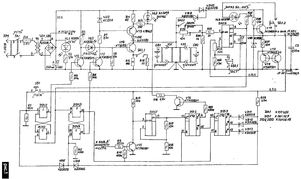 По техническим условиям на аккумулятор заряд идет при температуре 20...30°С. Принципиальная схема АРЗУ показана на рис.1. АРЗУ состоит из силовой части зарядноразрядной цепи, выполненной на дискретных элементах, и схемы управления на микросхемах. Силовая часть (помимо трансформатора Т1 с диодным мостом VD1...VD4 и конденсатора фильтра С1) включает транзисторный ключ VT4 с разрядными резисторами R12, R15 и генератор тока на транзисторе VT3. Транзисторы VT1 и VT2 управляют соответственно работой разрядной и зарядной цепей. Резистор R12 определяет ток разряда АБП, а в случае подключения элемента ток разряда определяет резистор R15 при включенном переключателе SA2.1. Заряд изделия возможен при открытом ключе VT2, разряд - при закрытом ключе VT1. Диод VD8 запрещает утечку заряда с изделия после окончания процесса заряда, хотя небольшая утечка тока (~ 1 мА) идет через резисторы R19, R20. Напряжение со вторичной обмотки трансформатора, выпрямленное диодным мостом и сглаженное конденсатором фильтра С1, поступает через разделительный диод VD10 на параметрический стабилизатор напряжения (резистор R26, стабилитрон VD14, транзистор VT7). С эмиттера последнего снимают напряжение (8,5 В) для питания микросхем. На выход этого стабилизатора подключены через резистор R27 два транзистора с комплементарной симметрией, образующие источник эталонного напряжения 1,25 В, необходимый для работы схемы сравнения напряжений. Требуемая величина этого напряжения задается на вход схемы сравнений потенциометром R23. Разряд АБП происходит через транзистор VT4, работающий в режиме ключа, и разрядный резистор R12 до напряжения 10 В, которое после делителя напряжения АБП на 10 (т.е. до 1 В) резисторами R19, R20 поступает на инверсный вход компаратора DA1.2. На прямой вход DA1.2 поступает от эталонного источника напряжение 1 В. На шине питания стабилизатора напряжения через диодную схему ИЛИ (диоды VD9 и VD10) логически суммируются напряжения от двух источников: выпрямленное и сглаженное напряжение вторичной обмотки трансформатора и напряжение АБП, благодаря чему при пропадании напряжения сети в течение цикла заряда АБП, заряд последнего прекращается, но время разряда, прошедшее до момента исчезновения напряжения сети, остается в памяти счетчиков таймера и памяти триггеров управления, так как их питание идет от заряжаемого АБП через диод VD9. При появлении напряжения сети заряд автоматически продолжается без нажатия кнопки ПУСК с учетом ранее наработанного времени заряда. Схема управления разрядно-зарядной цепью включает компаратор DA1.2, триггерный формирователь счетных импульсов из напряжения сети - транзистор VT5, микросхему DA1.1 с резисторами R17, R18 в цепи положительной обратной связи и две схемы памяти - одна на DD1.1 и DD1.2, вторая на DD1.3 и DD1.4. На вход формирователя счетных импульсов подают с обмотки трансформатора синусоидальное напряжение сети, а с его входа снимают нормированные временные импульсы с крутыми фронтами и спадами с периодом 20 мс. По спадам срабатывает таймер, задающий время заряда изделия. Таймер выполнен на двух параллельно включенных двоичных счетчиках - микросхемах на DD2 и DD3. Подсчитав определенное количество входных импульсов с периодом 20 мс за 15 ч, эти микросхемы выдают на трех выходах (VD11...VD13) единичные логические уровни. Схема совпадений на этих диодах срабатывает и в свою очередь выдает чере