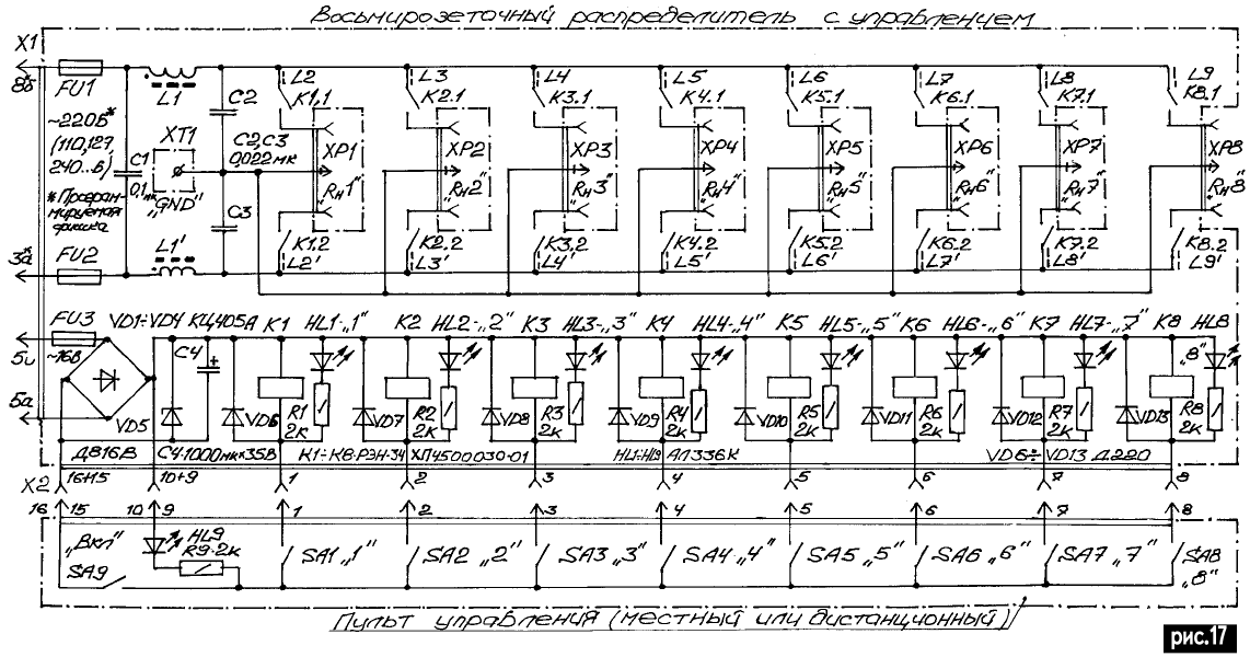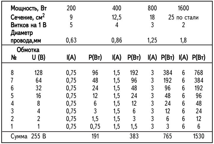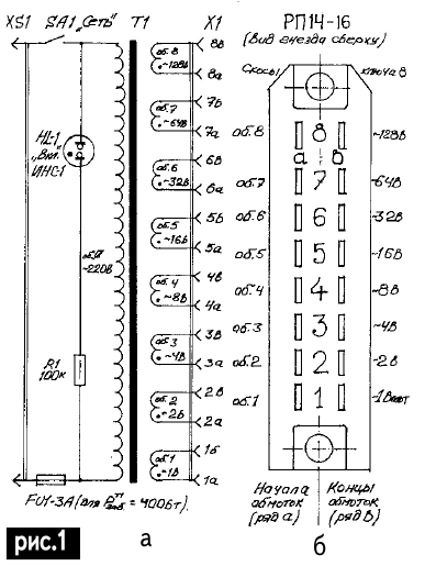 ЭНЦИКЛОПЕДИЯ РАДИОЭЛЕКТРОНИКИ И ЭЛЕКТРОТЕХНИКИ Сетевой источник переменного тока Уникум. Энциклопедия радиоэлектроники и электротехники Энциклопедия радиоэлектроники и электротехники / Блоки питания У радиолюбителя обычно имеются в хозяйстве различные трансформаторы переменного тока. Все они, как правило, различной мощности, с различными наборами напряжений. Когда задумаешь подключить новый прибор, оказывается, что все имеющееся никуда не годится. Может выручить ЛАТР, но не у всех он есть, да и не будешь прибор постоянно питать от ЛАТРа. У меня реализована такая идея. Перематываете трансформатор максимально большой мощности (из имеющихся у вас) так, чтобы сделать восемь вторичных обмоток. Первая обмотка рассчитана на выходное напряжение 1 В, вторая - на 2 В, третья - на 4 В и далее с каждой новой обмоткой напряжение удваивается. На последней восьмой обмотке выходное напряжение равно 128 В. Принципиальная схема трансформатора (я назвал его "Уникум") показана на рис.1,а. Выводы вторичных обмоток подпаивайте на контакты розетки Х1 типа РП1416, которая представляет собой ножевой соединитель с улучшенными характеристиками (умощненный) и пригодна для коммутации силовых цепей с токами до 6 А. Как розетка, так и вилка РП14 имеют большую механическую прочность (их применяли в старой ламповой аппаратуре, где токи накала достаточно велики). Выводы каждой из обмоток надо припаять на свою пару контактов розетки Х1 РП14-16 (рис.1,б): первой обмотки - на 1а и 1б; второй обмотки - на 2а и 2б, ..., восьмой обмотки - на 8а и 8б. При этом нужно следить, чтобы начала обмоток подключить на контакты "а", а концы - на контакты "б". На рис.1,а самая высоковольтная вторичная обмотка показана вверху схемы, самая низковольтная - внизу. Это нарушение ЕСКД, но оно допущено по той причине, что восьмая обмотка распаяна на контакты 8а и 8б, которые расположены возле двух скосов гнезда Х1 (мнемонически показывающих направление повышения напряжения обмоток). Габаритная мощность трансформатора может быть какой угодно, но при выбранном соединителе РП14 ток не должен превышать 6 А, поэтому габаритная мощность трансформатора не может превышать 1,5 кВт. Такой трансформатор еще не слишком велик для использования в быту, к тому же номинальный ток, на который рассчитаны сетевые розетки и выключатели также составляет 6 А. Применение трансформатора такой мощности практически решит все проблемы в быту, мастерской, лаборатории. Например, через него можно включать бытовые приборы с сетевым напряжением, отличающимся от нашего стандарта (например, 240, 127, 110 В и т.д.). Можно, например, подключать самые разнообразные паяльники (на напряжения 24, 36, 42 В) и другие, причем есть паяльники с недогревом и с перегревом (можно точно подобрать нужное напряжение). В табл.1 приведены сведения для изготовления трансформаторов мощностью от 200 до 1600 Вт (четыре варианта). Таблица 1