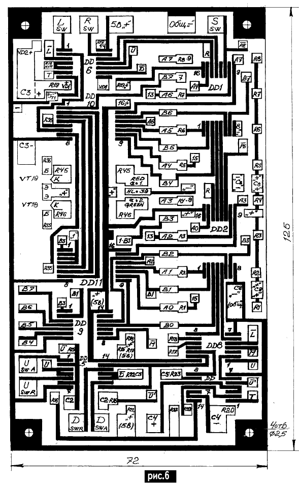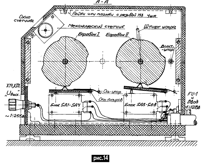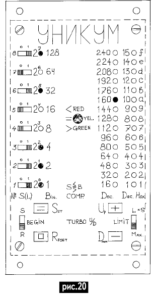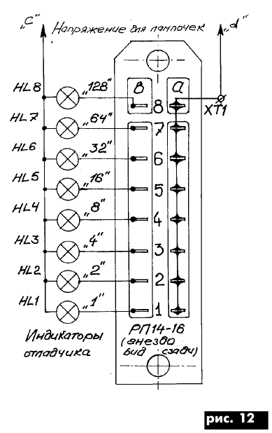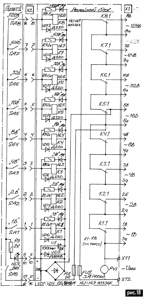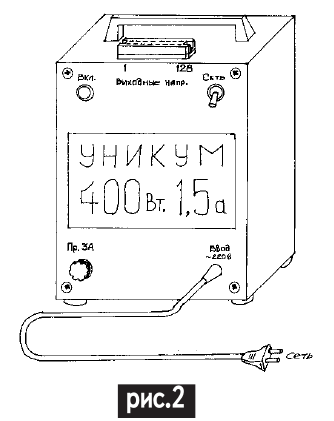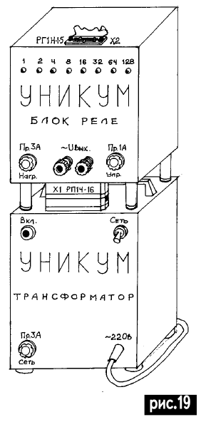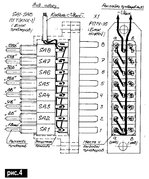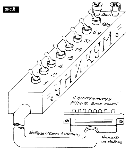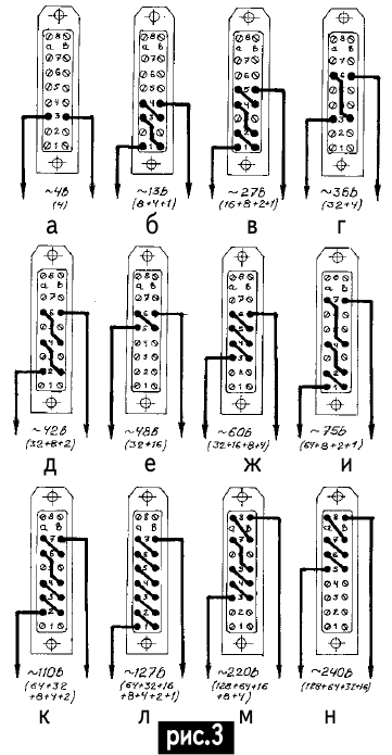 Трансформатор можно выполнить на стержневых сердечниках распространенных типоразмеров. Например, для варианта 200 Вт подойдет сердечник от телевизионного трансформатора ТС-200 (или ТС-180) СЛ 24х45, а для варианта 400 Вт - ТС-360 (ТС-330) СЛ 25х50. Удобство таблицы заключается в том, что получается целое число витков обмотки на 1 В выходного напряжения (5, 4, 3, 2 витков для мощностей соответственно 200, 400, 800 и 1600 Вт). Кроме того, все вторичные обмотки можно выполнить проводом одного диаметра, что позволяет упростить технологию намотки, обеспечить оптимальный тепловой режим и применить один предохранитель для суммарного выходного напряжения. На рис.2 показан рекомендуемый вариант исполнения корпуса трансформатора "Уникум". Оптимальным мне кажется размещение трансформатора на полу. Поэтому розетка Х1 установлена на верхней плоскости корпуса, там же имеется ручка для переноски трансформатора. Все бао стальные элементы (выключатель S индикатор включения HL1, предохранитель FU1 и ввод сетевого шнура) установлены на вертикальной передней панели. Корпус желательно снабдить упругими (резиновыми) ножками для устойчивости. Теперь перейдем к распайке вилки РП14 для получения любого напряжения от 1 до 255 В с шагом 1 В. Как видно из рис.1, напряжения 1, 2, 4, 8, 16, 32, 64 и 128 В можно получить от одной из выбранных обмоток, подключившись к контактам "а" и "б" соответствующего ряда. Такой вариант показан на рис.3,а для выходного напряжения 4 В. Максимальное напряжение 255 В получается при последовательном включении всех восьми вторичных обмоток. На вилке РП14 при этом устанавливают наклонные перемычки (1б-2а, 2б-3а, 3б-4а, ..., 7б-8а), а напряжение 255 В снимают с контактов 1а и 8б. Все другие варианты получения напряжений образуются расчетом двоичного кода выбранного напряжения. Например, напряжение 13 В получают суммированием напряжений 1-й, 3-й и 4-й обмоток, так как 13 = 8 + 4 + 1. Как видно из рис.3,б перемычка при этом обходит ненужную вторую обмотку (соединяет 1б и 3а), напряжение 27 В получают суммированием напряжений 1-й, 2-й, 4-й и 5-й обмоток, так как 27 = 16 + 8 + 2 + 1. Как видно из рис.3,в перемычка обходит ненужную третью обмотку, напряжение 36 В получают суммированием напряжений 3-й и 6й обмоток (36 = 32 + 4), перемычка соединяет (рис.3,г) конец третей и начало шестой обмоток. Для получения стандартных напряжений 42, 48, 60, 75, 110, 127, 220 и 240 В конфигурация перемычек показана соответственно на рис.3,д...н. Выводы, показанные на рис.3 стрелками, являются выходными и образуют кабель. Поскольку выходное напряжение кабеля может быть опасным для жизни, то выводы вилки после распайки выходного кабеля следует тщательно изолировать (лучше всего крышкой или колпаком). Переход на новое напряжение требует нескольких минут перепайки выводов. Но, если кому-либо лень это делать и у него есть восемь тумблеров на рабочий ток не менее 6 А, то можно рекомендовать схему рис.4, в которой при левом положении тумблера соответствующая обмотка включена в цепочку обмоток, при правом - отключена. Тогда переход на требуемое напряжение заключается в переводе этого напряжения в двоичный код и выставления тумблерами этого двоичного кода. Для перехода на двоичный код следует запомнить степени числа 2: 20 = 1; 21 = 2; 22 = 4; 23 = 8; 24 = 16; 25 = 32; 26 = 64; 27 = 128. Теперь от нужного напряжения (например, 167 В) отнимаем самое большое число из этого ряда (но меньшее нужного) 167 - 128 = 39, с