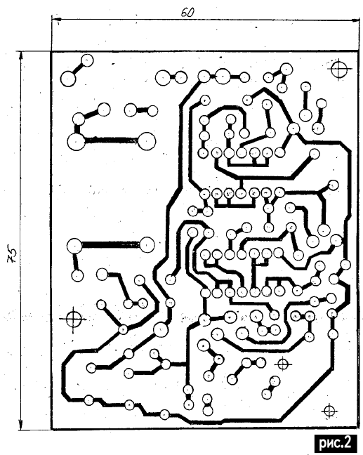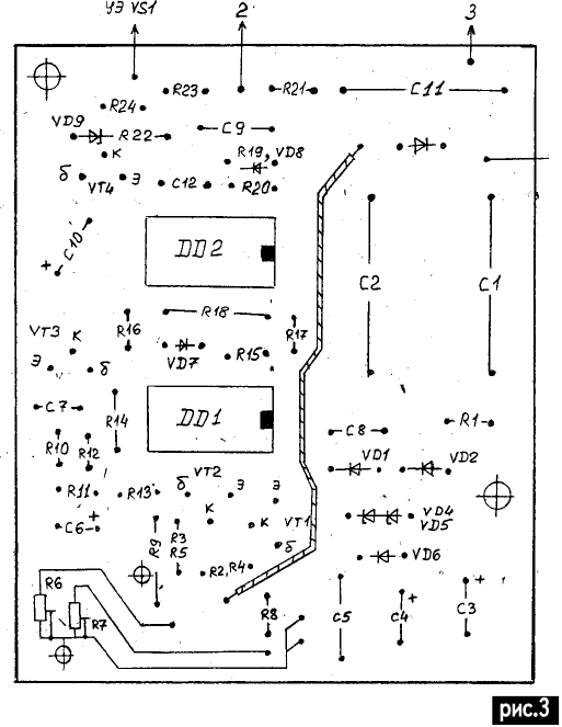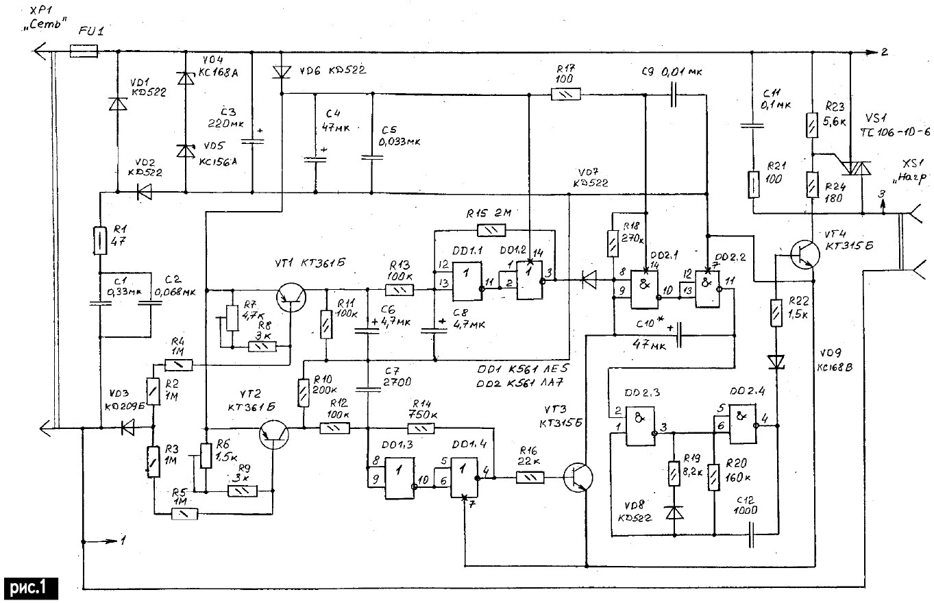 Налаживание устройства сводится к установке требуемых порогов выключения нагрузки и времени задержки на включение. Исходное состояние резистора R6 - минимальное сопротивление, R7 - максимальное. На время налаживания емкость конденсатора С10 выбирают в пределах 10-22 мкФ, а вместо нагрузки включают лампу накаливания. При налаживании необходимо учитывать, что устройство гальванически связано с сетью. Для выбора порога выключения в канале минимального предела нужно установить с помощью ЛАТРа на выходе устройства минимальное (для используемой нагрузки) напряжение и регулировкой R7 добиться отключения нагрузки от сети. Вращать R7 нужно медленно, так как из-за наличия емкостей С6 и С8 при быстром вращении R7 можно получить завышенный порог срабатывания. При регулировке канала максимального предела устанавливают требуемое максимальное напряжение на входе и регулировкой R6 добиваются отключения нагрузки. Затем проверяют работу устройства при изменении входного напряжения. Если необходимо, корректируют пороги отключения в каналах. При увеличении сопротивления резисторов R6 и R7 отключение нагрузки происходит при меньших входных напряжениях. Изменяя емкость С10, подбирают требуемое время задержки на включение. Ориентировочно время задержки (с) t=R18С10, где R18 - сопротивление (в Ом); С10 - емкость (в Ф). При R18=270 кОм, С10=220 мкФ время задержки составляет примерно 1 мин. При использовании в качестве нагрузки коллекторных двигателей проверяют устойчивость работы устройства в условиях помех, создаваемых двигателем. Если происходит отключение от помех (при нормальном напряжении в сети), то необходимо увеличить С7 на 200-1000 пФ (определяют опытным путем). Не следует чрезмерно увеличивать емкость конденсатора С7, так как это отразится на времени отключения при резком повышении напряжения в сети. При отсутствии ЛАТРа на вход устройства можно подать напряжение с регулятора (рис.4). В этом случае нагрузку к розетке XS1 не подключают, а контроль при настройке ведут вольтметром или осциллографом на выводе 11 DD2. Уровень "0" соответствует отключению, а уровень "1" - подключению нагрузки к сети. При использовании осциллографа контроль можно вести и по наличию импульсов управления на коллекторе VT4. Методика настройки не отличается от описанной выше.