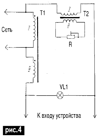 В схеме на рис.4 трансформатор T1 любой на 220 В с вторичной обмоткой на напряжение UII=30+ΔUI, где UII - напряжение вторичной обмотки T1; ΔUI - минимальное падение напряжения на первичной обмотке T2 при R=0. Трансформатор T1 должен иметь несколько вторичных обмоток, тогда при регулировке устройства можно более точно установить напряжение, включая нужное количество обмоток, и при этом потребуется резистор R с меньшим диапазоном изменения сопротивления. Трансформатор T2 может быть на 220 В, но лучше иметь сетевую обмотку с отводом на 110-127 В. Напряжение на вторичной обмотке 20-30 В. Резистор R - проволочный мощностью 25-50 Вт сопротивлением 20-50 Ом. Лампа VL1 мощностью 25-40 Вт. При больших мощностях лампы требуется и большая мощ4.сирность резистора R. Конкретные параметры элементов схемы уточняют экспериментально в зависимости от имеющихся в распоряжении. Наличие трансформатора T2 обеспечивает гальваническую развязку от сети резистора R и безопасность при регулировке. При подключенной нагрузке к устройству и закрытом симисторе нагрузка остается подключенной к сети через цепь С11R21. Особенно это нежелательно при подключении маломощного трансформатора, так как индуктивность обмотки и цепь С11R21 образуют последовательный контур. Это при определенных условиях (при минимальной нагрузке трансформатора или при попадании на вход устройства повышенного напряжения из сети) может привести к превышению рабочего напряжения сетевой обмотки трансформатора. Поэтому следует определить экспериментально возможность подключения к устройству маломощной нагрузки. Для этого маломощную нагрузку включают в сеть через конденсатор емкостью 0,1 мкФ и измеряют напряжение на ней. Умножают измеренное значение на 1,7. Если полученное напряжение не является опасным, а пониженное напряжение (при питании через конденсатор) не создает нежелательных режимов для нагрузки, то такую нагрузку можно подключать к устройству. Если нагрузка содержит трансформатор питания, то ее включают в сеть поочередно через конденсатор емкостью 0,01; 0,05; 0,1 мкФ, чтобы из-за резонанса напряжение на обмотке трансформатора не превысило максимально допустимого при напряжении в сети 220 В. Если этого не происходит, то далее определяют возможность устройства для защиты, как описано выше. Описанное устройство проверялось при совместной работе с холодильником, стационарным телевизором и звуковоспроизводящим комплексом. Телевизор имеет импульсный источник питания (не имеет трансформатора дежурного режима) и испытывался в обычном и дежурном режимах; в звуковоспроизводящем комплексе любой из источников включался совместно с усилителем. Никаких изменений в работе защищаемых устройств не обнаружено. Литература: