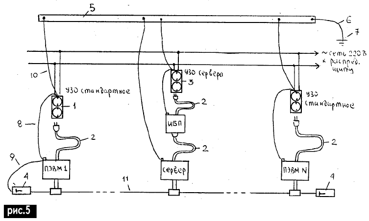 Устройства защитного отключения (УЗО) выпускались серийно много лет назад [4]. Современная микросхемотехника позволяет создать настолько малогабаритные устройства, что их можно встроить в сетевую вилку. Еще в конце 80-х в журнале "Electronics" была описана микросхема, содержащая основные блоки УЗО. Подобную микросхему (К1182СА1) выпускает и НПЦ "СИТ" (Россия, г.Брянск) [5]. Автору пока что не встречались компьютерные кабели, в вилку которых было бы встроено УЗО, а самостоятельно изготовить такой кабель, по-видимому, достаточно сложно. Однако вполне возможно встроить такое устройство в колодку питания - коробку из изоляционного материала, на которой закреплены 2-3 компьютерные (с тремя контактами) розетки и к которой подведены обычная двухштырьковая сетевая вилка с кабелем и провод заземления. Таким образом, для обеспечения электробезопасности одиночному пользователю компьютера можно рекомендовать применение УЗО совместно с заземлением; заземление к тому же отводит статический потенциал с корпуса компьютера, что повышает надежность работы оперативной памяти и винчестера компьютера [6]. В случае применения УЗО требования к заземлению становятся не такими жесткими (его сопротивление может быть и больше 4 Ом, больше сопротивления основного заземлителя; это не приведет к увеличению напряжения прикосновения как в системах с занулением). Недостаток применения УЗО - возможная потеря данных при его срабатывании, однако с этим приходится мириться. В локальных компьютерных сетях обеспечение электробезопасности выглядит несколько иначе. Электромонтажная схема локальной сети изображена на рис.5. Сервер питается через источник бесперебойного питания (ИБП); в этом ИБП вторичные цепи гальванически изолированы от питающей сети. С точки зрения электробезопасности ИБП (в английской транскрипции UPS) можно считать "усовершенствованным аналогом" разделительного трансформатора; ни один из двух выходных питающих проводов заземлению не подлежит (так же, как не заземляется ни один из выводов вторичной обмотки разделительного трансформатора). Разумеется, было бы неплохо оснастить ИБП все компьютеры локальной сети, что исключило бы потерю данных, однако это решение требует достаточно больших затрат. Оснастить свой компьютер ИБП может, конечно, и одиночный пользователь, однако стоимость ИБП, по крайней мере, в несколько раз превышает стоимость УЗО. К тому же существуют ИБП, в которых вторичные цепи гальванически не изолированы от сети; "истинные" ИБП с гальванической изоляцией стоят дороже. ИБП, питающий сервер, питается через УЗО, но это УЗО несколько отличается от "стандартного" (на рис.5), через которое питаются остальные компьютеры локальной сети. "УЗО стандартное" отключает питание от компьютера, если появляется ток утечки на землю. УЗО сервера не отключает питание при утечке, а лишь включает звуковой сигнал, свидетельствующий о том, что на корпусе ИБП существует напряжение прикосновения. Можно вставить такое же УЗО между ИБП и сервером, звуковой сигнал в этом случае будет свидетельствовать об ухудшении изоляции в блоке питания сервера. Корпусы всех компьютеров дополнительно соединены отдельными проводниками 8 и 10 с заземляющим контактом колодки питания 1 (или присоединены заземляющим проводником непосредственно к магистрали заземления 5 как сер