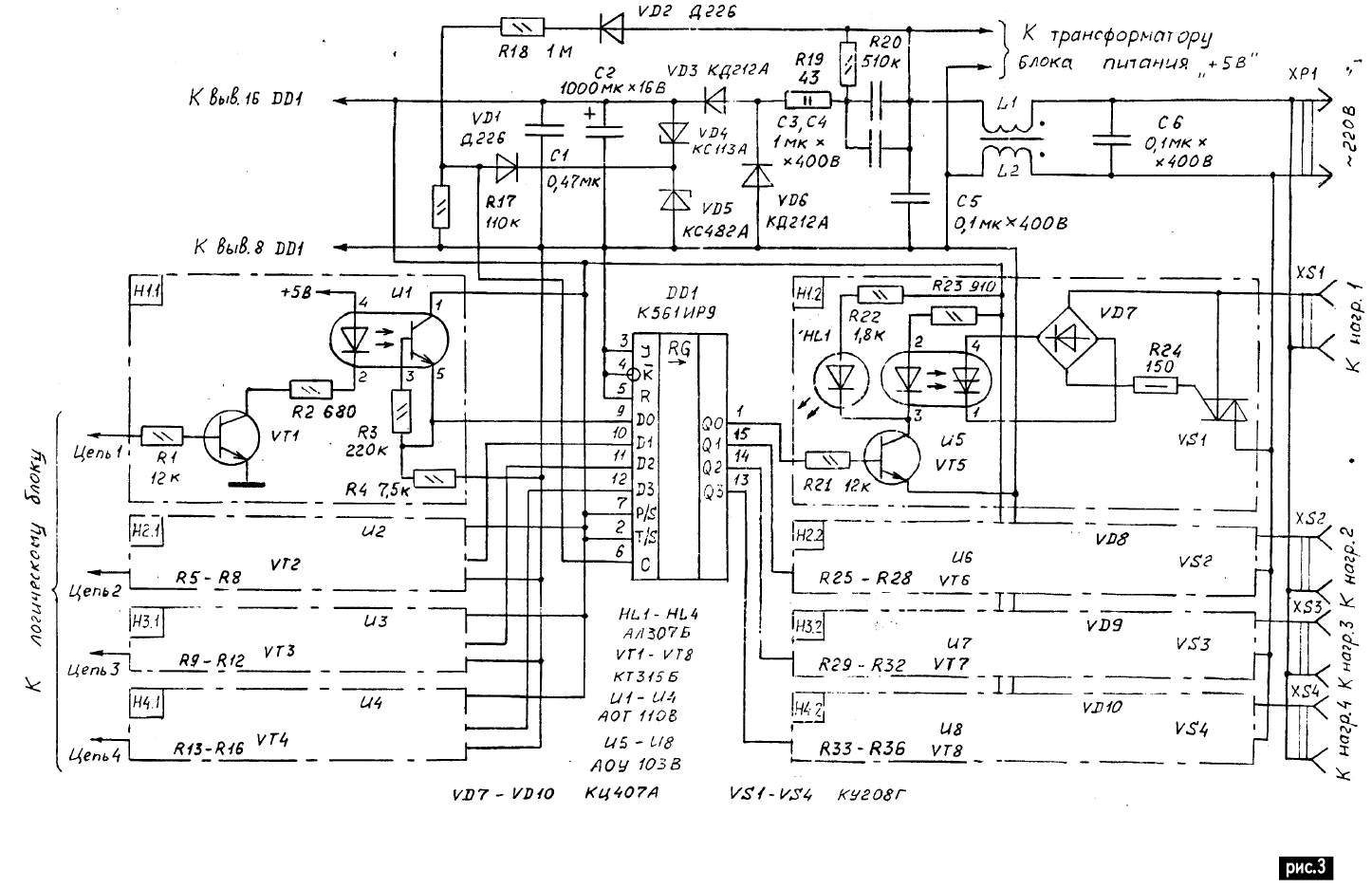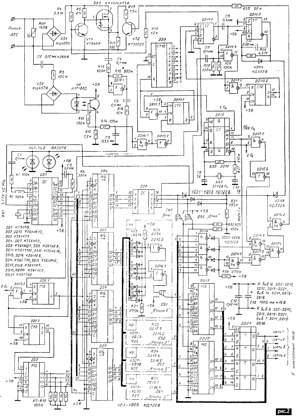 ЭНЦИКЛОПЕДИЯ РАДИОЭЛЕКТРОНИКИ И ЭЛЕКТРОТЕХНИКИ Силовой коммутатор с удаленным управлением. Энциклопедия радиоэлектроники и электротехники Энциклопедия радиоэлектроники и электротехники / Телефония Предлагаемое устройство предназначено для работы в телефонной сети общего пользования. Оно позволяет дистанционно, используя телефонную линию, включать и выключать сетевые электроприборы малой и средней (до 1 кВт) мощности. Устройство имеет четыре канала, (управляет четырьмя нагрузками). Количество каналов можно произвольно увеличить путем наращивания. Питание коммутатора осуществляется от сети переменного тока 220 В. Подключать устройство в месте его установки к телефонной линии можно без соблюдения полярности параллельно местному телефонному аппарату (МТА). В дежурном режиме устройство не нагружает линию, не реагирует на речевые сигналы и импульсные или DTMF-сигналы набора номера, поступающие с МТА или из линии. Удаленное управление нагрузками коммутатора (изменение их состояний) проводится только в режиме занятия им линии. Коммутатор занимает линию после поступления на МТА с АТС определенного количества входящих вызывных сигналов (посылок.). Для управления нагрузками используются стандартные DTMF-сигналы, поступающие с удаленного телефонного аппарата (УТА), с которым у коммутатора установилось соединение. Если УТА не имеет функции DTMF-набора, управлять можно с биппера, который подносится пользователем к микрофону микротелефонной трубки УТА. Коммутатор работает в интерактивном режиме, т.е. не только принимает из линии команды управления, но и выдает в линию сигналы, по которым пользователь может судить о выполнении своих команд и о текущем состоянии нагрузок. Каждая из нагрузок имеет собственный адрес - трехзначную комбинацию, состоящую из цифр 0 - 9, символов #, * и букв A, B, C, D. Устройство воспринимает четыре команды: включить нагрузку с некоторым адресом, выключить нагрузку с некоторым адресом, запросить текущее состояние нагрузки с некоторым адресом и освободить линию. Устройство выдает в линию три вида сигналов: "оповещение пользователя о занятии линии" - прерывистый сигнал с основным тоном 1024 Гц длительностью 3,5 - 4 с; "оповещение пользователя о включенном состоянии нагрузки с некоторым адресом" непрерывный сигнал с основным тоном 1024 Гц длительностью 2 с; оповещение пользователя о выключенном состоянии нагрузки с некоторым адресом" - прерывистый сигнал с основным тоном 1024 Гц длительностью 2 с. Если после занятия коммутатором линии из нее не поступают DTMF-сигналы в течение 1-2 мин, происходит автоматическое освобождение линии с возвратом устройства в дежурный режим. Электрические параметры коммутатора, касающиеся его взаимодействия с телефонной линией, не выходят за рамки, установленные для телефонных аппаратов любого класса сложности [1]. Собственные и управляющие сигналы устройства по частоте лежат в пределах полосы пропускания телефонного канала (0,3 - 3 кГц). На базе предлагаемого устройства можно создать систему дистанционного дискретного регулирования какого-либо параметра или систему индивидуального оповещения большого числа (теоретически до 163) абонентов по одной телефонной линии, например, в пределах одного учреждения. Структурная схема коммутатора приведена на рис.1, а принципиальная схема логического (ци