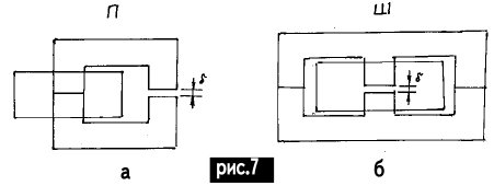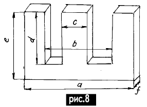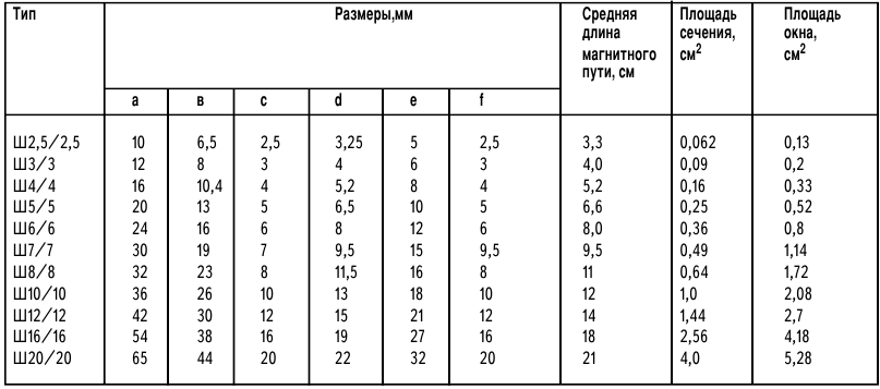 Сердечники обратноходовых ПН изготовляют в виде П-образных или Ш-образных магнитопроводов (рис.7). Так как трансформатор выполняет роль дросселя, то одну из сторон сердечника подпиливают абразивным материалом (лучше алмазным надфилем). Немагнитный зазор выполняют в пределах 0,1...0,3 мм, в зазор вставляют картон при сборке. Наиболее часто встречающиеся габаритные показатели Ш-образных магнитопроводов приведены в табл.3 и на рис.8. Таблица 3