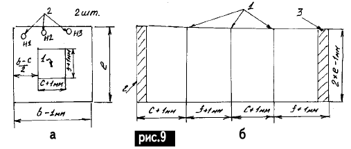 Расчет дросселей обратноходовых ПН Сердечник дросселя должен запасти требуемую пиковую энергию в небольшом зазоре без вхождения в насыщение и иметь приемлемые потери в магнитопроводе. Кроме того, он должен вмещать требуемое количество витков, обеспечивающее приемлемые потери в обмотках. Воспользуемся известной формулой [3]: Pгаб = IkUk = 4fwkBmSc10-4Ik; (1) Uk = 4fwkBmSc10-4, (1a) где Ргаб - габаритная мощность трансформатора, Вт; Ik - средний ток коллектора, А; Uk - напряжение, прикладываемое к первичной обмотке дросселя, В; f - частота преобразования, Гц; Bm - индукция магнитного поля, Тл (для однотактных ПН Вm = Bs - Br составляет примерно 0,7 от табличного значения); Sc - площадь сечения стержня магнитопровода, см2; wk - количество витков первичной обмотки. Из (1) следует, что количество витков первичной обмотки можно найти так: w1 = 0,25Uk104/(f BmSc). (2) Индуктивность дросселя: L = µ0 µr (w1)2 Sc/l, (3) где L - индуктивность, Гн; µ0 = 4π10-7 - абсолютная магнитная проницаемость; µr - относительная магнитная проницаемость; Sc - площадь поперечного сечения магнитопровода, м2; l - длина пути магнитной линии, м. Для грубой оценки необходимого сечения сердечника можно воспользоваться выражением: Sc = (10...20) (Pн/f)1/2, (4) где Pн - мощность нагрузки, Вт; Sc - площадь поперечного сечения сердечника, см2; f - частота преобразования, Гц. Воспользовавшись формулами (2) и (4), а также анализируя данные табл.2, находим габаритные показатели сердечника и количество витков первичной обмотки. Для вторичной и остальных обмоток wн = w1 Uk/Uн, где Uн - напряжение на нагрузке. Для обмотки возбуждения w2 (см. рис.4) рекомендуется напряжение примерно 5 В. Диаметр проводов d = 1,13 (I/j)1/2, (5) где d - диаметр провода, мм; I - средний ток в обмотке, А; j - плотность тока в обмотке (рекомендуется 2,5...5 А/мм2), причем для внутренней обмотки плотность тока должна быть наименьшей. Для проверки вычислений рассчитаем площадь, занимаемую каждой обмоткой, и суммируем, при этом должно выполняться неравенство: Soк = w1d1 + w2d2 + w3d3 + ... + wndn + hz, (6) где Sок - табличное значение площади окна, см2 ; wn количество витков в обмотке n; dn - диаметр провода в обмотке n; hz - суммарная толщина каркаса и межобмоточной изоляции. Каркасы, на которые наматывают обмотки трансформаторов, прессуют из пластмасс, склеивают из электрокартона или собирают из отдельных деталей, изготовленных из расслоенного текстолита, прессшпана или электрокатрона, при небольших габаритах используют любой картон. Стандартное изготовление каркаса из картона подробно описано в [4], для трансформаторов небольшой мощности автор предлагает второй способ изготовления трансформатора рис.9. Он состоит из трех заготовок. Гильзу изготовляют из картона (рис.9,б), слегка надрезают линии 1 заготовки, после чего ее сворачивают в параллелепипед и края 2 склеивают по контуру 3 папиросной бумагой. Заготовку (рис.9,а) делают в количестве 2 шт. При этом вырезают сердцевину 1 и пробивают аккуратно заточенной по краям иглой от шприца отверстия D0,3 мм, после чего их нумеруют (на верхней половине каркаса как Н1, Н2, Н3, ..., а на нижней - как К1, К2, К3, ...). Верхнюю и нижнюю половины каркаса склеивают с гильзой папиросной бумагой и оставляют конструкцию под тяжелым предметом на несколько часов. Намотка обмоток на каркас ведется аналогично [4] в следующем порядке Wупр, W1, Wнагр (для экспериментальных вариантов Wупр может быть последней). Сборка Ферритовые стержни