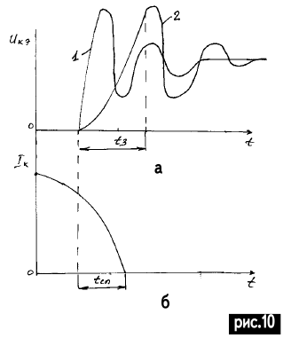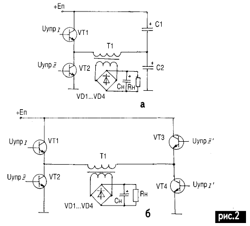 ЭНЦИКЛОПЕДИЯ РАДИОЭЛЕКТРОНИКИ И ЭЛЕКТРОТЕХНИКИ Схемотехника импульсных блоков питания. Энциклопедия радиоэлектроники и электротехники Энциклопедия радиоэлектроники и электротехники / Блоки питания Импульсные блоки питания (ИБП) все чаще применяются в бытовой и промышленной аппаратуре. Современная схемотехника ИБП настолько развита, что по количеству элементов приравнивается к линейным блокам питания, а по многим параметрам превышает показатели линейных БП. Эксплуатация ИБП в сетях, где переменное напряжение 220 В имеет (в режиме перегрузки или перекоса фазы) разброс параметров от 160 до 280 В, дает огромное преимущество над линейными БП. Кроме этого, высокий КПД позволяет значительно снизить потребление энергии от сети (что немаловажно для малоимущих семей). Импульсные блоки питания делятся на однотактные преобразователи напряжения (ОПН) и двухтактные. В свою очередь, однотактные преобразователи делятся на ПН с обратным включением диода (ОПНО) (обратноходовые) рис.1,а и с прямым включением диода ОПНП ( прямоходовые) рис.1,б. Двухтактные делятся на ПН с полумостовой схемой включения (рис.2,а) и с мостовой схемой включения (рис.2,б). Согласно анализу, проведенному в [1], область применения ПН зависит от мощности нагрузки (рис.3), при этом схемы включения ПН различны. В импортной бытовой аппаратуре наиболее часто можно встретить схему обратноходового ПН, так как она имеет очень малое количество элементов. Но для нормальной работы этой схемы необходимы качественные элементы, отсутствующие в широком спектре на рынке электронных компонентов Украины. Работа некачественных радиодеталей сильно влияет на многие показатели ИБП. Рассмотрим работу однотактного преобразователя напряжения с обратным включением диода. Их часто называют обратноходовые из-за передачи знергии в нагрузку в момент запирания ключа транзистора. На рис.4 показана упрощенная схема современного обратноходового ПН. Период t0 - t1. Как только подается напряжение питания +Еп, через Rогр, RД1, RД2 протекает ток, при этом С3 заряжается током через Rогр, Rд1, С3, переход Б-Э транзистора VTk (рис.5,а). Транзистор VTk постепенно открывается t0 t1 (рис.5,б), возникает коллекторный ток IKVT (рис.5,в), протекающий по пути: +Еп, Rогр, w1, переход Э-Б транзистора VTk - земля. На обмотке w2 наводится ЭДС той же полярности, что и напряжение, приложенное к w1, согласно закону самоиндукции (начало точки на обмотках) . ЭДС самоиндукции плюсом прикладывается через VD1, Rб к переходу Б-Э VTk, транзистор еще больше отпирается. Заметим, что в цепи нагрузки ток не протекает. Ток цепи коллектора VТk растет до насыщения транзистора, при этом ток дросселя в w1 растет от нуля до ILmax, и пока ток коллектора изменяется и растет, происходит намагничивание сердечника дросселя L. На рис.6 изображена петля гистерезиса. Так как напряженность магнитного поля прямо пропорциональна току, протекающему в обмотке w1, Iw1= Hl/w, где Н - напряженность магнитного поля; l - длина пути магнитной линии; w - число витков, то напряженность магнитного поля в сердечнике дросселя будет так же постепенно расти от нуля до HIm (рис.6, кривая 1). Период t1 - t2. В момент насыщения транзистора VTk (заметим, что этот момент не совпадает с моментом насыщения сердечника из-за особенностей построения схемы) ток коллектора транзистора VTk достигает максимального значения (задействованы в