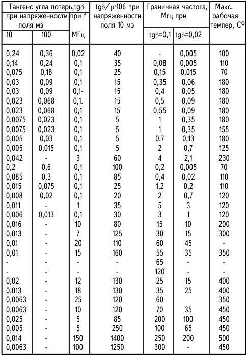 Современные магнитомягкие ферриты можно разделить на несколько групп, различающихся электромагнитными параметрами и назначением. В обозначении марки феррита цифры соответствуют номинальному значению начальной магнитной проницаемости, первая буква Н означает, что феррит низкочастотный, вторая буква М- марганец-цинковый феррит, Н - никель-цинковый; буквы ВЧ указывают, что феррит предназначен для работы на высоких частотах. Ферриты марок 6000НМ, 4000НМ, 3000НМ, 2000НМ, 1500НМ, 1000НМ используют на частотах до нескольких сотен кГц как в слабых, так и в сильных полях. В слабых полях ферриты этой группы применяют в случаях, когда не предъявляют повышенных требований к температурной стабильности. Ферриты первых трех марок рекомендуется применять в магнитопроводах вместо листового пермаллоя толщиной 0,1-0,02 мм и меньше. Ферриты марок 2000НМ1, 1500НМI, 1500НМ2, 1500НМ3, 1000НМ3 и 700НМ предназначены для использования в слабых и средних полях при частотах до 3 МГц. Они обладают малыми потерями и малым ТКµ в широком интервале температур. При повышенных требованиях к термостабильности µ в широком интервале температур предпочтительнее использование ферритов трех последних марок. Ферриты марок 2000НН, 1000НН, 600НН, 400НН, 200НН и 100НН применяют в слабых полях в диапазоне частот до нескольких МГц. Ферриты трех первых марок значительно уступают марганец-цинковым ферритам с такими же значениями µ, однако они более дешевы, поэтому широко применяются в различной аппаратуре при невысоких требованиях к стабильности и потерям. Остальные ферриты находят широкое применение в катушках контуров и магнитных антенн. Ферриты марок 150ВЧ, 100ВЧ, 50ВЧ2, 30ВЧ2 и 20ВЧ предназначены для использования в слабых полях на частотах до 100 МГц. Они отличаются малыми потерями и малым ТКµ в широком интервале температур, поэтому наиболее широко применяются для высокочастотных катушек индуктивности, а также для антенн переносных радиоприемников. Ферриты марок 300НН, 200НН2, 150НHI, 90НН, 60НН, 55НН, 33НН и 10ВЧ1 отличаются малыми потерями в сильных полях. Их основное назначение - для сердечников катушек контуров, перестраиваемых подмагничиванием, и контуров магнитных модуляторов. В слабых полях tgδ и ТКµ этих ферритов значительно больше, чем ферритов группы ВЧ. Основные данные магнитомягких ферритов приведены в табл.2. Единицы пересчета для системы СИ: 1 Гс- 10-4 Тл. Таблица 2