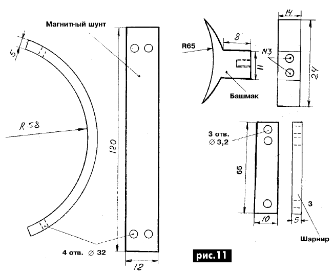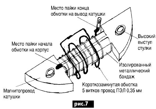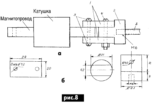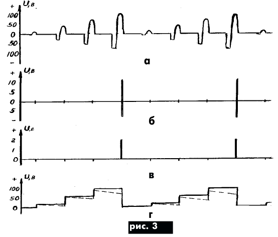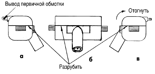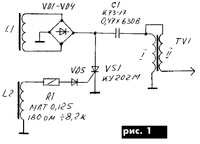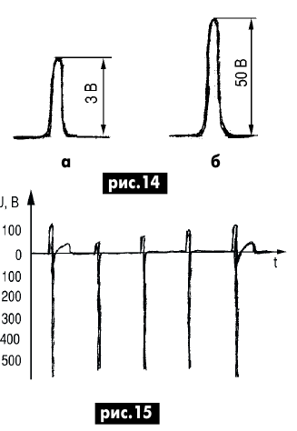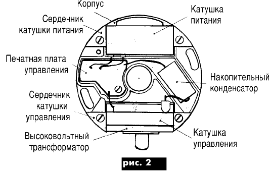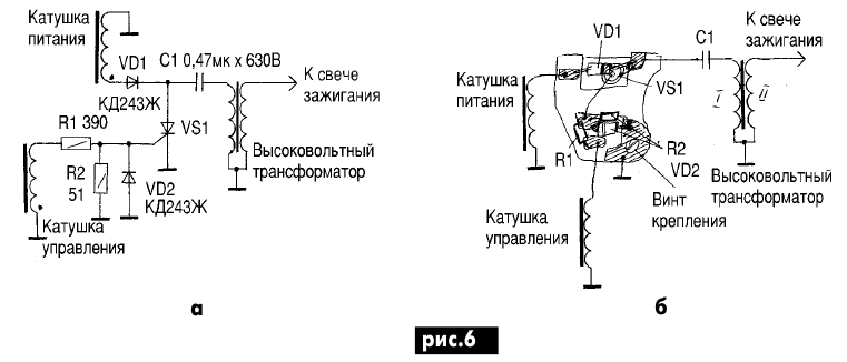 Хочу поделиться собственным опытом по ремонту и проверке блоков электронного зажигания типа ЭМ1, МБ1 (несколько вариантов), МБ2, МБ22. Такие блоки чаще всего используют на бензопилах и лодочных моторах малой мощности. Несмотря на некоторые отличия в конструкции все они работают по одному принципу - это схема тиристорного зажигания с накопительным конденсатором. Рассмотрим принцип работы этих устройств. На рис.1 изображена катушка питания L1, в которой при движении полюсов магнитов маховика двигателя мимо ее сердечника наводится переменное напряжение. Оно выпрямляется диодным мостом VD1-VD4. Через обмотку I высоковольтного трансформатора TV1 заряжается накопительный конденсатор С1. Катушка L2 (катушка управления) также находится в изменяющемся магнитном поле маховика двигателя. Когда поршень приближается к верхней "мертвой точке", на ее незаземленном выводе появляется напряжение положительной полярности, которое через резистор R1 и диод VD5 поступает на управляющий электрод тиристора VS1. Тиристор открывается, конденсатор С1 быстро разряжается через обмотку I трансформатора TV1, в обмотке II возбуждается импульс высокого напряжения. К выходу этой обмотки подключена свеча зажигания, где и образуется "искра". После разряда конденсатора С1 до некоторой величины тиристор закрывается. Начинается новый цикл заряда и все процессы повторяются. Параметры элементов схемы приведены в табл. 1. Конструктивно блоки ЭМ1 и МБ1 выглядят, как показано на рис.2. В них сердечники катушек питания и управления разнесены в пространстве. Высоковольтный трансформатор крепят теми же винтами, что и катушку управления, но она не имеет внешнего сердечника, поэтому влиянию внешних магнитных полей подвержена слабо. Все устройство находится в магнитном поле постоянных магнитов, закрепленных в маховике двигателя. Однако полюса магнитов сориентированы и расположены таким образом, что за один полный оборот коленчатого вала в катушке питания наводится четыре периода переменного импульсного напряжения, а в катушке управления - один. На рис.3 приведены осциллограммы напряжений, полученные на стенде, речь о котором пойдет ниже. Эти эпюры близки к реальным. При измерениях для исключения искажений формы исследуемых сигналов применяли делитель напряжения 1:10 и использовали открытый вход осциллографа. Поскольку эти напряжения являются определяющими для качественной работы блока, проанализируем их подробнее. Для схемы на рис.1 катушка питания подключена к нагрузке через диодный мост VD1-VD4, поэтому форма напряжения на ней симметричная. Некоторые искажения одного полупериода возникают из-за несимметричности изменения магнитного поля, формируемого стендом, но это не имеет принципиального значения (рис.3,а). С каждым периодом конденсатор С1 ступенчато заряжается до напряжения, примерно равного напряжению на катушке питания (рис.3,г). После четырех циклов заряда на катушке управления возникает положительный импульс (рис.3,б). Об отрицательном всплеске этого импульса поговорим позднее. Управляющий импульс (рис.3,в) через ограничительный резистор R1 и защитный диод VD5 открывает тиристор. Конденсатор разряжается через обмотку I высоковольтного трансформатора до единиц вольт и далее процесс повторяется. Казалось бы теперь, когда мы знаем, как работает блок электронного зажигани