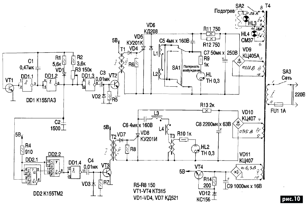Для его разборки полиэтиленовый бандаж необходимо разрубить с трех сторон по линиям, показанным на рис.9,а,б,в. Образовавшаяся крышка открывается, как показано на рис.9,в. Сам трансформатор вынимают за магнитопровод. Но сначала нужно вынуть вывод первичной обмотки, а потом винтовой вывод высокого напряжения. Поскольку направление его обмоток особого значения не имеет, то их также проще разрубить. Не пытаясь сохранить первичную обмотку. Строго говоря, если обмотки трансформатора включить согласованно, то напряжение на высоковольтном проводе будет выше, хотя и не настолько, чтобы это можно было заметить. Если намотка первичной обмотки никаких трудностей не представляет, то со вторичной дело обстоит куда сложнее. Еще раз взгляните на табл.1, и если у Вас нет подходящей изоляции или провода указанного диаметра (можно несколько тоньше), то дальнейшая работа бессмысленна по следующим причинам: при диаметре провода или толщине изоляции, больше указанных обмотка не вмещается в бандаж, который защищает ее от механических и электрических повреждений. Если применить изоляцию из пропитанной маслом трансформаторной бумаги она долго не проработает, а фторопластовая пленка не позволит уложить провод виток к витку, что в конечном счете приведет к межвитковым пробоям. Но если под руками все есть, то после разборки катушки желательно сохранить проклеенную арматуру катушки вместе с закрепленным на ней высоковольтным выводом. Как показано на рис.9,е. По мере намотки вторичной обмотки оставляйте все большие поля по краям (рис.9,д) во избежание электрического пробоя между верхними и нижними слоями. Количество витков не требует строгого подсчета, но наружный диаметр обмотки необходимо соблюсти, иначе обмотка либо не поместится в бандаже, либо будет болтаться во время работы двигателя и неизбежно выйдет из строя. После установки арматуры высоковольтного провода ее нужно перевязать тонкими прочными нитками. Катушку можно проверить на стенде без бандажа. Если же блок будет установлен на двигатель - обязательно произведите полную сборку трансформатора в обратном порядке, вставив на свое место низковольтный вывод. Швы аккуратно заплавьте горячим паяльником, не допуская попадания припоя. Принципиальная схема стенда приведена на рис.10. Он состоит из генератора импульсов, собранного на VT1, DD1.1, DD1.2 с регулируемой частотой следования импульсов от 0 до нескольких сотен герц, устанавливаемой переменным резистором R3. Изменение частоты равносильно изменению числа оборотов двигателя. Импульсы через инвертор DD1.3 подаются на базу транзистора VT2, нагрузкой которого служит импульсный трансформатор Т1. Открываясь, тиристор VD5 разряжает конденсатор С5 через обмотки возбуждения катушки питания L1 и L2, переключатель полярности возбуждения изменяет направление магнитного потока. Индикаторная лампочка HL1 служит для контроля наличия импульсов возбуждения и частоты их следования. На триггерах DD2 собран делитель частоты на 4 - в катушках возбуждения L3 и L4 обмотки управления импульсы тока формируются после каждого четвертого импульса в катушках L1, L2. Отличием этого канала возбуждения является лишь наличие цепи питания индикаторной лампы HL2, которая через повышающий трансформатор Т3 включена в цепь питания катушек. В блоке питания нужно установить резисторы R11, R1
