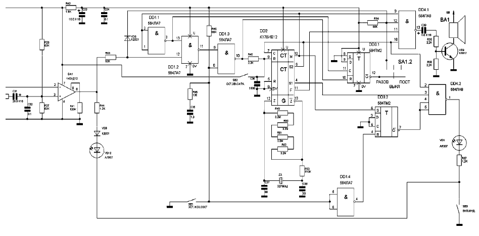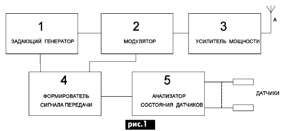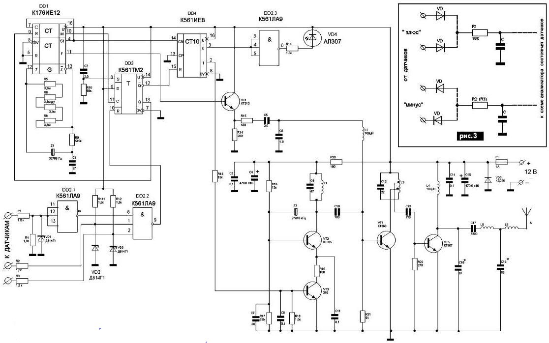 ЭНЦИКЛОПЕДИЯ РАДИОЭЛЕКТРОНИКИ И ЭЛЕКТРОТЕХНИКИ Радиодистанционное охранное устройство. Энциклопедия радиоэлектроники и электротехники Энциклопедия радиоэлектроники и электротехники / Охранные устройства и сигнализация объектов Отличительной особенностью предлагаемой конструкции является то, что сигнал тревоги звучит не из охраняемого автомобиля (в настоящее время такой сигнал тревоги вызывает только раздражение окружающих), а из портативного радиоприемника, который находится у владельца автомобиля или рядом с ним. В случае необходимости к приемнику можно подключить внешние исполнительные устройства. Сигнал тревоги может принимать любой вид, приемлемый для владельца охраняемого объекта. Устройство не имеет потайного выключателя. Его не так просто обезвредить: сигнал тревоги формируется не в случае обнаружения излучения передатчика, а в случае его пропадания. Поэтому охранное устройство срабатывает при отключении питания передатчика, при выводе его из строя (например, электрошокером), при постановке помехи и, разумеется, при срабатывании охранных датчиков. Потребительские качества (радиус действия, применяемый код) могут быть существенно изменены, как в сторону расширения, так и в сторону сужения, в зависимости от поставленной задачи и возможностей владельца. Устройство состоит из передатчика и приемника, работающих в Си-Би диапазоне. Передатчик. Структурная схема передатчика показана на рис.1. Задающий кварцевый генератор 1 управляется формирователем сигнала передачи 4 следующим образом. 1. Если все охранные датчики находятся в дежурном состоянии, то генератор 1 вырабатывает стабильные колебания в течение 1 с. Эти колебания модулируются по амплитуде в модуляторе 2 частотой 1024 Гц, усиливаются в усилителе мощности 3 и подаются в антенну. Далее следует пауза длительностью 9 с, и передатчик снова включается на 1 с. Если же срабатывает хоть один датчик, то передатчик блокируется на 39 с. За это время пропадают две секундные посылки, что и является признаком аварийного состояния. 2. Если автомобиль движется, и в нем установлены датчики перемещения, крена или акустические, то передатчик оказывается постоянно выключенным и возвращается в рабочее состояние спустя 39 с после срабатывания последнего датчика (например, после остановки автомобиля и закрывания дверей). Передатчик питается от источника постоянного тока напряжением 12 В. При установке в автомобиле передатчик потребляет средний ток 40 мА (120 мА в режиме передачи и 30 мА в режиме паузы). Принципиальная схема передатчика показана на рис.2. Задающий генератор собран по традиционной схеме с кварцевым резонатором Z2 на транзисторе VT2, цепь питания которого включается ключом на транзисторе VT3. Резистор R13 ограничивает базовый ток транзистора VT3, а R18 способствует надежному закрыванию при лог."0" на выводе 2 счетчика DD4. Конденсаторы С3, С8, С11 блокировочные. Коллекторной нагрузкой генератора является резонансный контур L1, C9, работающий в диапазоне 10 м (Си-Би диапазон). Сигнал несущей частоты через конденсатор С10 подается на базу транзистора VT4, выполняющего функции модулятора. Сюда же через дроссель L2 подается низкочастотный сигнал 1024 Гц. Промодулированная по амплитуде несущая выделяется на контуре с неполным включением L3. Далее сигнал передатчика через разделительный конд