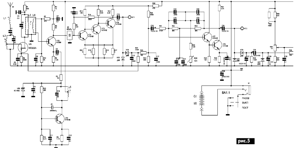 Приемник может работать в одном из двух режимов сигнализации: в режиме постоянной тревоги (сигнал тревоги звучит постоянно) или в экономичном режиме (формируется только одна серия звуковых сигналов тревоги). Принципиальная схема приемника приведена на рис.5. Усилитель радиочастоты (УРЧ) собран на полевом транзисторе VT1. Он нагружен на резонансный контур с трансформаторной связью L3, L4, C5. На входе УРЧ также включен высокодобротный контур L2, C2 для повышения избирательности приемника. Гетеродин собран на транзисторе VT3 по известной схеме со стабилизацией напряжения питания стабилизатором R3, VD2. Каскад на транзисторе VT2 выполняет функцию смесителя. Через пьезоэлектрический фильтр 465 кГц сигнал поступает на каскодный усилитель VT4-VT6, который и является УПЧ. Амплитудный детектор выполнен на германиевых диодах VD3, VD4. Принятый таким образом сигнал частотой 1024 Гц подается через разделительный конденсатор С16 на активный фильтр, настроенный на эту частоту. Этот фильтр собран по схеме двойного Т-моста на частотозадающих элементах С18-С23 и R29, R30, R32, R33, а также транзисторах VT7, VT8. С выхода фильтра сигнал через конденсатор С24 поступает на выпрямитель с удвоением напряжения VD5, VD6. Схема адаптации. При появлении напряжения на конденсаторе С27 заряжается помехоподавляющий конденсатор С29. Через ограничительный резистор R36 и конденсатор С31 напряжение подается на неинвертирующий вход компаратора DA1. При длительном воздействии входного сигнала, например, сильной индустриальной помехи, конденсатор С31 заряжается, управляющий ток прекращается, и компаратор "выключается". Однако при появлении полезного сигнала он сложится с фоновым, и напряжение на С31 повысится, что вызовет срабатывание компаратора. Конденсатор С32 устраняет прохождение на вход компаратора высокочастотных выбросов. Из-за большой инерционности такая схема некоторое время после прекращения воздействия сильной помехи не "слышит" полезного сигнала, поскольку постоянная времени разряда С31 составляет 1-3 периода сигнала передатчика. Однако она позволяет существенно увеличить дальность приема в связи с тем, что информацией является перепад от минимального в данный момент уровня к максимальному, а не сама абсолютная величина сигнала. Особенностью компаратора является его однополярное питание. Потенциалы входов устанавливаются резисторами R37, R38, R27, R35, R39, R40. Схема также не имеет отрицательной обратной связи, что определяет формирование логических уровней на выводе 6 DA1. Схема индикации и сигнализации. При включении питания цепью R45, R46, C35 счетчик DD2 и триггеры DD3 устанавливаются в "0". С выхода компаратора положительные импульсы длительностью 1 с и скважностью 10 поступают на вход DD1.2 (вывод 12), а после инверсии - на вход DD1.3 (вывод 9). С выхода этого элемента (вывод 10) положительные импульсы через резистор R48 поступают на вход R счетчика DD2 (вывод 9), устанавливая его в исходное состояние. При нормальном приеме сигналов передатчика счетчик не успевает переполниться, при этом на выводе 9 DD4.1 - лог."0", и звуковой сигнал на излучатель не проходит. Если в таком состоянии схемы нажать кнопку SB3 "Вкл. Индик.", то светодиод VD1 мигает с частотой 1 Гц и скважностью 4, поскольку на выводы 2 и 3 DD4.2 подаются импульсы с периодом 0,5 и 1 с соответственно. Светодиод VD1 вспыхивает в момент приема сигналов передатчика, причем 