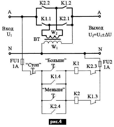 ЭНЦИКЛОПЕДИЯ РАДИОЭЛЕКТРОНИКИ И ЭЛЕКТРОТЕХНИКИ Простые вольтодобавочные устройства. Энциклопедия радиоэлектроники и электротехники Энциклопедия радиоэлектроники и электротехники / Регуляторы тока, напряжения, мощности В статье приводятся описания простых вольтодобавочных устройств, которые позволяют повысить напряжение в электрической сети на определенную величину или понизить его путем использования обычных понижающих трансформаторов. На практике нередко возникает необходимость, например, понизить повышенное напряжение до уровня номинального с целью продления срока службы ламп накаливания или повысить пониженное напряжение с целью увеличения светоотдачи ламп. Наиболее просто, доступно и экономично это можно осуществить с помощью обычного понижающего двухобмоточного трансформатора, включив его по схеме вольтодобавки. Такое включение означает, что вторичная низковольтная обмотка трансформатора включается последовательно с нагрузкой, а первичная, высшего напряжения, - параллельно к нагрузке или к зажимам сети. На рис.1 приведены схемы включения вольтодобавочных трансформаторов и их векторные диаграммы. С целью упрощения векторные диаграммы построены без учета потерь во вторичных обмотках трансформаторов. На рис.1,а приведены схема включения вольтодобавочного трансформатора и его векторная диаграмма при согласном включении его обмоток, при котором магнитные потоки обмоток совпадают по направлению. На рис.1,б показана схема при встречном включении обмоток, что приводит к встречному направлению магнитных потоков и, следовательно, к уменьшению результирующего магнитного потока трансформатора. Как видно из представленных рисунков, с помощью обычного понижающего трансформатора можно повысить или понизить напряжение на нагрузке на величину ±∆U в зависимости от того, каким образом включены его обмотки - согласно или встречно. Иными словами, необходимая величина вольтодобавки определяется величиной напряжения вторичной обмотки обычного понижающего трансформатора. Рассмотрим пример. Имеем однофазный понижающий трансформатор типа ОСО-0,25 (осветительный однофазный мощностью 250 ВА) напряжением 220/36 В (в обиходе называемый "котельник"), намотанный на Г-образном сердечнике. Вторичное напряжение данного трансформатора 36 В и будет составлять величину вольтодобавки U=36 В, которая может добавляться к напряжению сети 220 В или отниматься от него в зависимости от согласного или встречного включения обмоток: 220+36=256 или 220−36=184 (В). Предположим, что напряжение в сети понижено и составляет 180 В, тогда с помощью обычного трансформатора по схеме вольтодобавки, при согласном включении обмоток, его можно поднять, приблизить к номинальному, так как U2=180+36=216 (В). При повышенном напряжении в сети, например, U1=256 В относительно номинального на нагрузке его можно понизить, поменяв местами концы любой из обмоток трансформатора. В этом случае для нашего примера U2=U1−∆U=256−36=220 (B), т.е. на зажимах нагрузки имеем номинальное напряжение. В тех случаях, когда необходимая величина вольтодобавки не соответствует стандартным вторичным напряжениям трансформаторов, вторичную обмотку перематывают на необходимое напряжение, например, на 20 В. При этом не исключается возможность домотки или отмотки определенного количества витков вторичной о