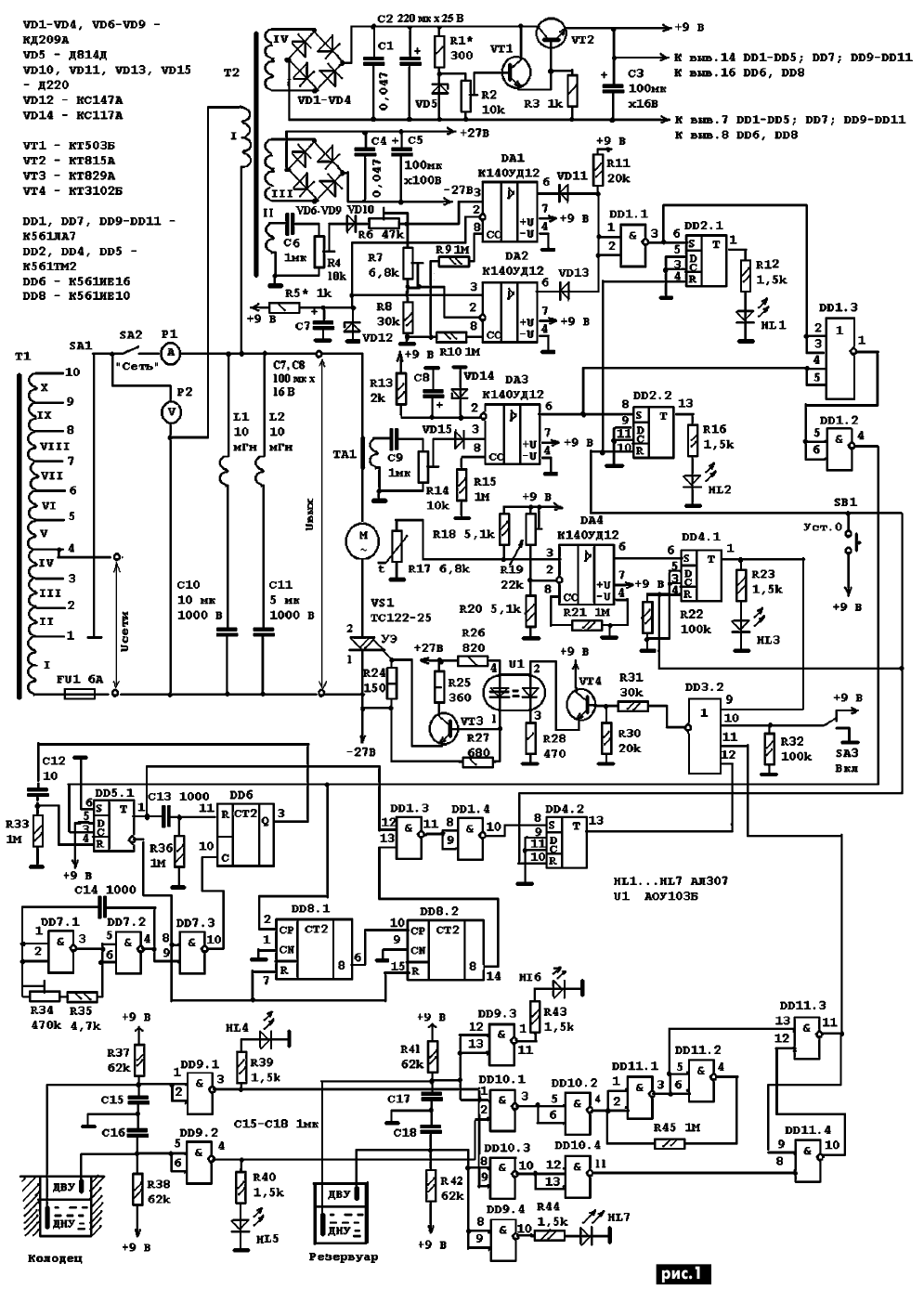 ЭНЦИКЛОПЕДИЯ РАДИОЭЛЕКТРОНИКИ И ЭЛЕКТРОТЕХНИКИ Автоматизация работы и защита от перегрузок электродвигателей насосов мощностью 180...250 Вт. Энциклопедия радиоэлектроники и электротехники Энциклопедия радиоэлектроники и электротехники / Электродвигатели Незаменимыми помощниками садоводов и огородников (при наличии рядом расположенного водоема или колодца) являются электронасосы мощностью 180...250 Вт типа "Малыш", "Струмок". Но иногда случаются неприятности и с этими трудягами: выход из строя из-за несоответствия нормам сетевого напряжения, перегрева обмотки статора электродвигателя, заклинивания ротора и, как следствие, повышения до недопустимого тока через обмотку статора, отсутствие воды в водоеме или ее мутность. Практически от всех бед спасет вашего друга разработанная мной схема автоматического управления и защиты от предельно допустимых режимов работы электронасосов мощностью 180...250 Вт (рис.1). На первый взгляд схема очень сложная, но это не так. В схеме применены цифровые и аналоговые микросхемы, которые практически не требуют наладки. Предохранитель FU1 применен в схеме для подстраховки. Кому не известно, что пока перегорает предохранитель, выгорает полтелевизора? Электроника действует гораздо быстрее и надежнее при защите любого аппарата, механизма. Кроме того, в схеме отсутствуют релейные элементы. В наше время только в крайних случаях, безвыходных ситуациях необходимо применять реле, контакторы, магнитные пускатели, ведь существуют оптроны, тиристоры, симисторы... Вместо дорогих и не очень надежных механических контактов необходимо применять вышеуказанные электронные приборы. Регулятор напряжения сети построен на автотрансформаторе Т1 и переключателе SA1. Даже если в вашем доме стабильное напряжение 200...230 В, не спешите игнорировать его применение. Соберите эту схему и опробуйте, в каком диапазоне питающих напряжений электродвигатель насоса обеспечивает необходимую мощность на валу. Если, например, этот диапазон будет составлять 170...230 В, установите переключателем SA1 выходное напряжение регулятора сети около 190 В. В дальнейшем мы установим нижний допустимый предел напряжения 170 В, подаваемого на обмотку статора двигателя, а верхний - 210 В. В этом случае надежность и долговечность обмотки статора электродвигателя возрастет, да и потребляемая мощность снизится. Регулятор напряжения сети рассчитан на минимальное напряжение в вашем доме 140 В и максимальное 260 В (чтобы получить Uвх=220 В). Следует отметить, что в автотрансформаторах по сравнению с силовыми трансформаторами первичная обмотка может быть намотана проводом в 2-3 раза тоньше. Если переделать сетевой трансформатор мощностью 200 Вт в автотрансформатор, то можно будет подключать нагрузку до 400...600 Вт. Можно использовать переделанный силовой трансформатор телевизора УЛПЦТИ-61 (ТС-270-1), у которого первичная обмотка I (1-2-3) содержит 318 витков провода ПЭВ-1 D0,91 мм (выводы I-I). Для этого необходимо разобрать трансформатор, удалить все вторичные обмотки и экранирующую фольгу. Сверху оставшейся первичной обмотки необходимо намотать обмотки II-X проводом D0,8...1 мм. Обмотки II-IV содержат по 19 витков; обмотки V-X - по 35 витков каждая. Контакты переключателя SA1 должны быть рассчитаны на ток не менее 10 А (можно применить обычный 3-4-секционный галетный переключатель, включив соответс