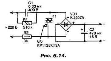 Âåñüìà èíòåðåñíûì ñõåìíûì ðåøåíèåì ÿâëÿåòñÿ èñïîëüçîâàíèå ñèììåòðè÷íîãî äèíèñòîðà äëÿ ñòàáèëèçàöèè íàïðÿæåíèÿ áåñòðàíñôîðìàòîðíîãî áëîêà ïèòàíèÿ ñ ãàñÿùèì êîíäåíñàòîðîì. Ñõåìû óñòðîéñòâ ïðèâåäåíû íà ðèñ. 6.14 è ðèñ. 6.15.